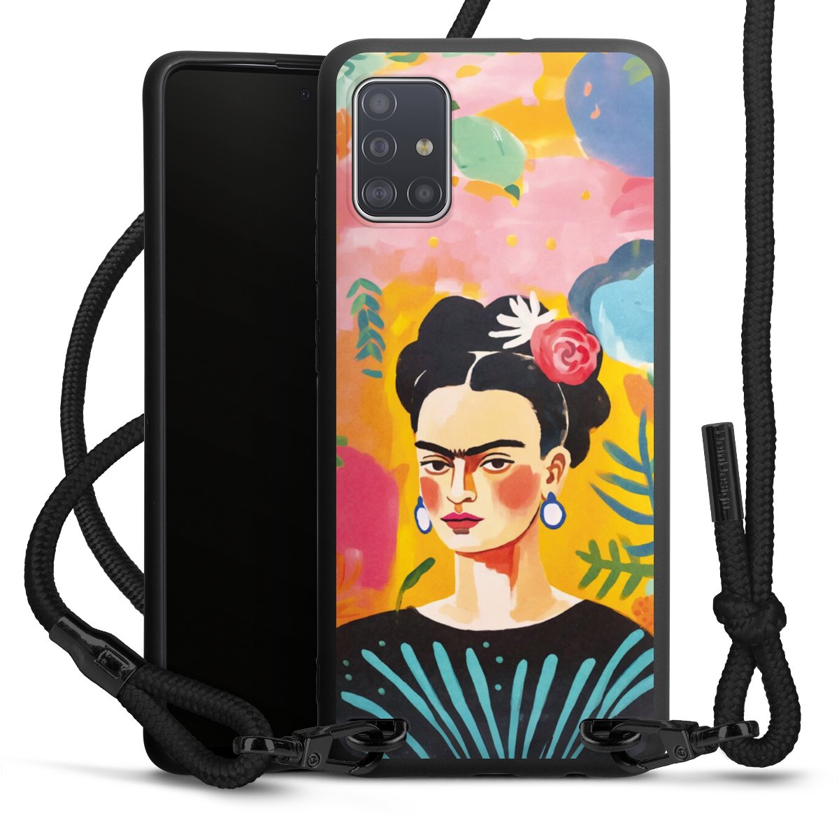 The matt black silicone case is made of flexible TPU (thermoplastic polyurethane) and offers robust protection. The durable, unbreakable material makes the cover flexible and dimensionally stable at the same time. The matte surface makes your design stand out more and is less susceptible to fingerprints and dirt. The stylish trend accessory fits comfortably in the hand and is perfectly complemented by the fabric (polyester) mobile phone strap. The braided fabric strap is approx. 1.70 metres long with a diameter of approx. 0.5 cm. Due to the special knotting technique, the length of the strap can be adjusted by simply pulling it, so that you can adapt it individually to your wishes. The practical case to wear around your neck is available with the fabric strap in black. As a little icing on the cake, we have provided the strap with a chic metal fastener in matt black. The strap is securely fastened to the case with loops made of high-quality genuine leather and press studs. The ends of the fabric strap are covered with metallic end caps and thus protected from fraying.