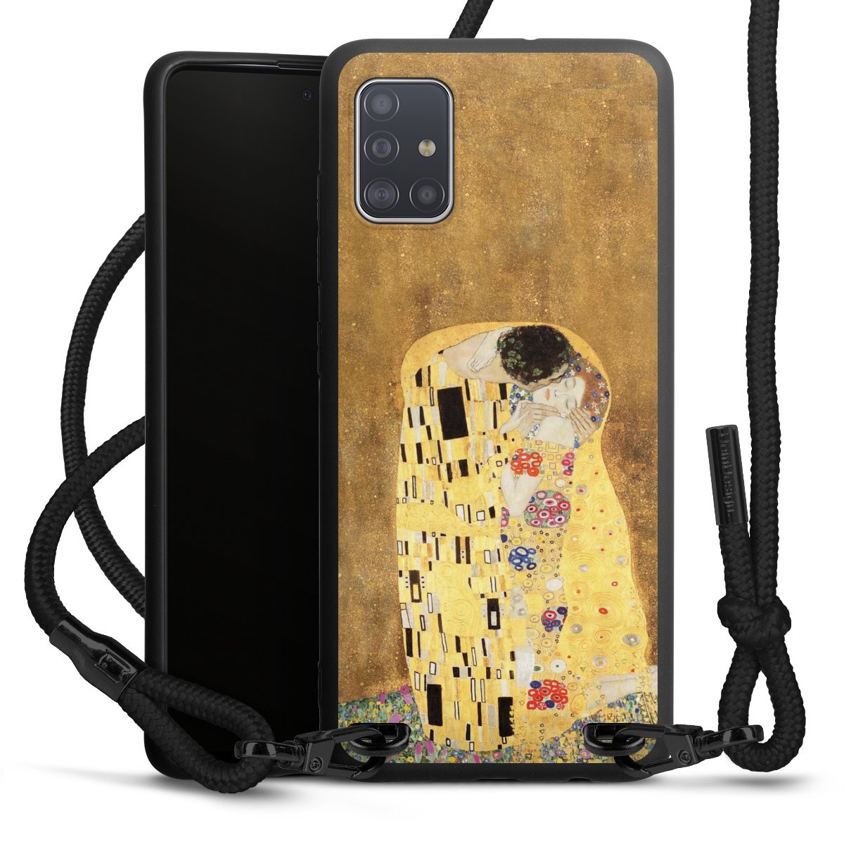 The matt black silicone case is made of flexible TPU (thermoplastic polyurethane) and offers robust protection. The durable, unbreakable material makes the cover flexible and dimensionally stable at the same time. The matte surface makes your design stand out more and is less susceptible to fingerprints and dirt. The stylish trend accessory fits comfortably in the hand and is perfectly complemented by the fabric (polyester) mobile phone strap. The braided fabric strap is approx. 1.70 metres long with a diameter of approx. 0.5 cm. Due to the special knotting technique, the length of the strap can be adjusted by simply pulling it, so that you can adapt it individually to your wishes. The practical case to wear around your neck is available with the fabric strap in black. As a little icing on the cake, we have provided the strap with a chic metal fastener in matt black. The strap is securely fastened to the case with loops made of high-quality genuine leather and press studs. The ends of the fabric strap are covered with metallic end caps and thus protected from fraying.