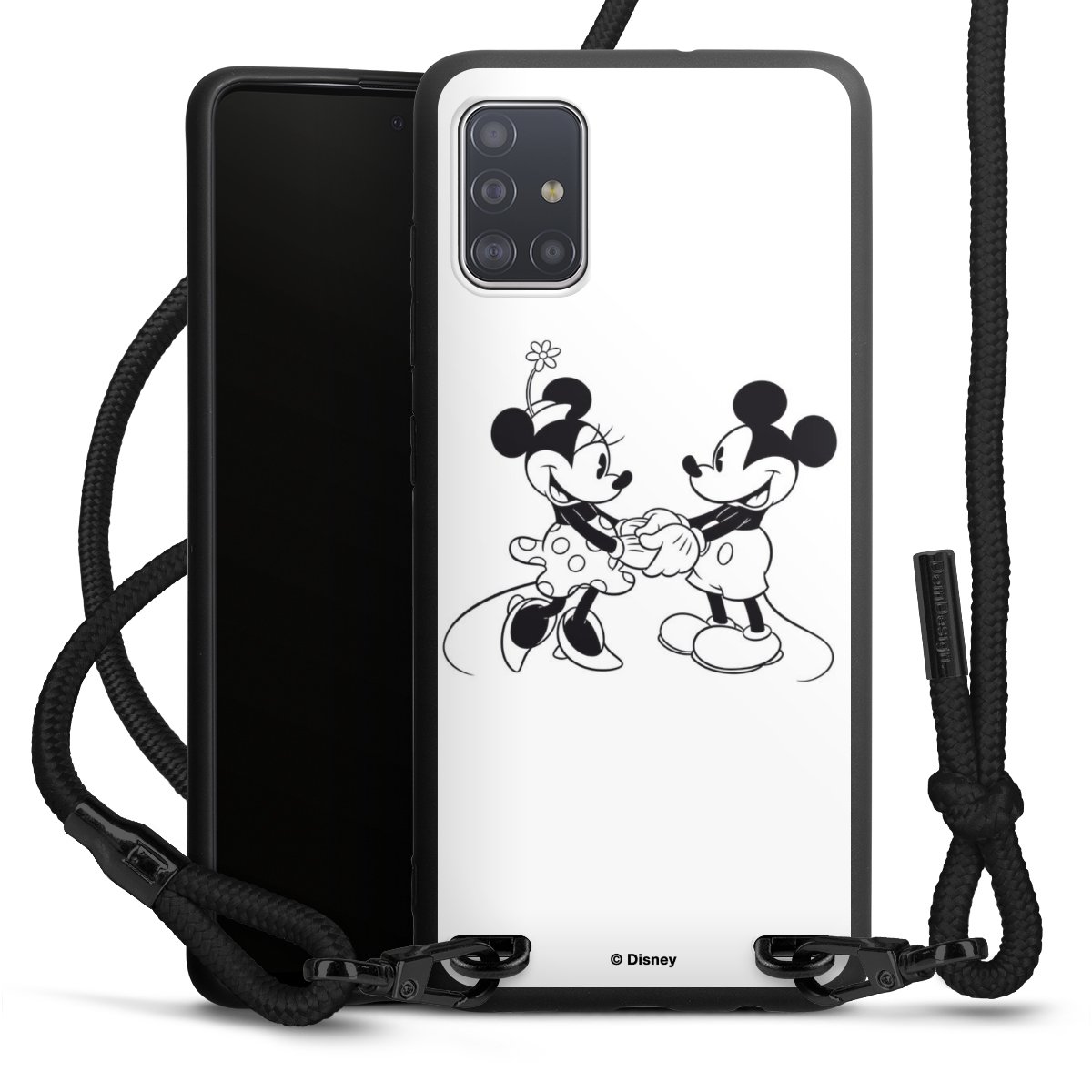 The matt black silicone case is made of flexible TPU (thermoplastic polyurethane) and offers robust protection. The durable, unbreakable material makes the cover flexible and dimensionally stable at the same time. The matte surface makes your design stand out more and is less susceptible to fingerprints and dirt. The stylish trend accessory fits comfortably in the hand and is perfectly complemented by the fabric (polyester) mobile phone strap. The braided fabric strap is approx. 1.70 metres long with a diameter of approx. 0.5 cm. Due to the special knotting technique, the length of the strap can be adjusted by simply pulling it, so that you can adapt it individually to your wishes. The practical case to wear around your neck is available with the fabric strap in black. As a little icing on the cake, we have provided the strap with a chic metal fastener in matt black. The strap is securely fastened to the case with loops made of high-quality genuine leather and press studs. The ends of the fabric strap are covered with metallic end caps and thus protected from fraying.