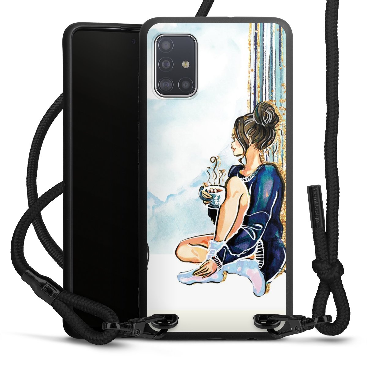 The matt black silicone case is made of flexible TPU (thermoplastic polyurethane) and offers robust protection. The durable, unbreakable material makes the cover flexible and dimensionally stable at the same time. The matte surface makes your design stand out more and is less susceptible to fingerprints and dirt. The stylish trend accessory fits comfortably in the hand and is perfectly complemented by the fabric (polyester) mobile phone strap. The braided fabric strap is approx. 1.70 metres long with a diameter of approx. 0.5 cm. Due to the special knotting technique, the length of the strap can be adjusted by simply pulling it, so that you can adapt it individually to your wishes. The practical case to wear around your neck is available with the fabric strap in black. As a little icing on the cake, we have provided the strap with a chic metal fastener in matt black. The strap is securely fastened to the case with loops made of high-quality genuine leather and press studs. The ends of the fabric strap are covered with metallic end caps and thus protected from fraying.
