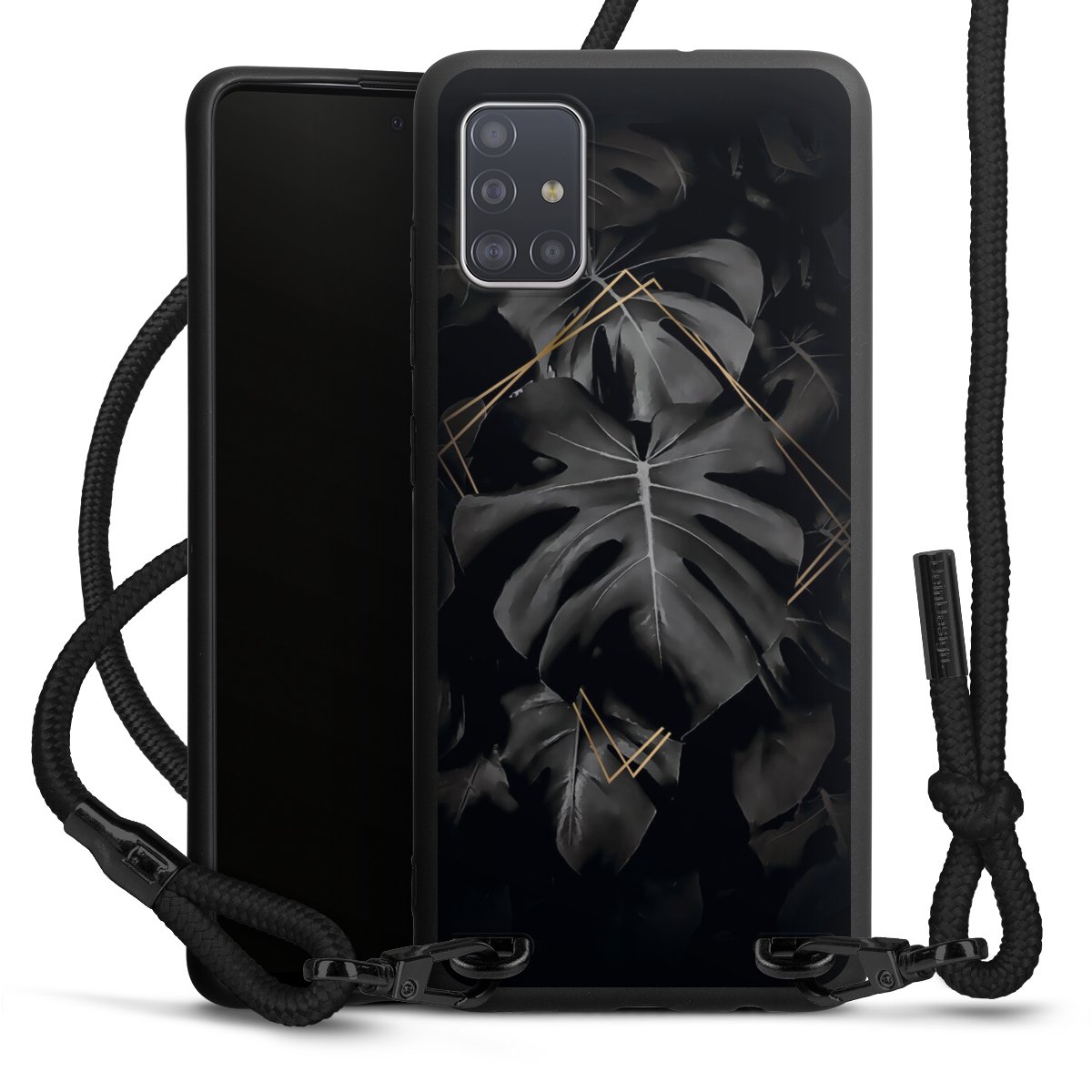 The matt black silicone case is made of flexible TPU (thermoplastic polyurethane) and offers robust protection. The durable, unbreakable material makes the cover flexible and dimensionally stable at the same time. The matte surface makes your design stand out more and is less susceptible to fingerprints and dirt. The stylish trend accessory fits comfortably in the hand and is perfectly complemented by the fabric (polyester) mobile phone strap. The braided fabric strap is approx. 1.70 metres long with a diameter of approx. 0.5 cm. Due to the special knotting technique, the length of the strap can be adjusted by simply pulling it, so that you can adapt it individually to your wishes. The practical case to wear around your neck is available with the fabric strap in black. As a little icing on the cake, we have provided the strap with a chic metal fastener in matt black. The strap is securely fastened to the case with loops made of high-quality genuine leather and press studs. The ends of the fabric strap are covered with metallic end caps and thus protected from fraying.