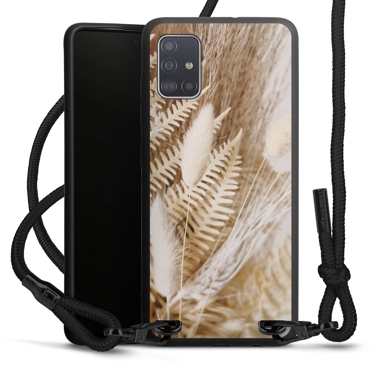 The matt black silicone case is made of flexible TPU (thermoplastic polyurethane) and offers robust protection. The durable, unbreakable material makes the cover flexible and dimensionally stable at the same time. The matte surface makes your design stand out more and is less susceptible to fingerprints and dirt. The stylish trend accessory fits comfortably in the hand and is perfectly complemented by the fabric (polyester) mobile phone strap. The braided fabric strap is approx. 1.70 metres long with a diameter of approx. 0.5 cm. Due to the special knotting technique, the length of the strap can be adjusted by simply pulling it, so that you can adapt it individually to your wishes. The practical case to wear around your neck is available with the fabric strap in black. As a little icing on the cake, we have provided the strap with a chic metal fastener in matt black. The strap is securely fastened to the case with loops made of high-quality genuine leather and press studs. The ends of the fabric strap are covered with metallic end caps and thus protected from fraying.