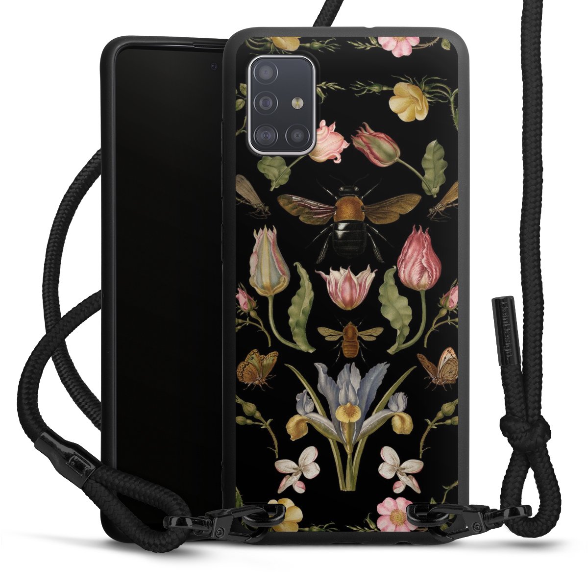 The matt black silicone case is made of flexible TPU (thermoplastic polyurethane) and offers robust protection. The durable, unbreakable material makes the cover flexible and dimensionally stable at the same time. The matte surface makes your design stand out more and is less susceptible to fingerprints and dirt. The stylish trend accessory fits comfortably in the hand and is perfectly complemented by the fabric (polyester) mobile phone strap. The braided fabric strap is approx. 1.70 metres long with a diameter of approx. 0.5 cm. Due to the special knotting technique, the length of the strap can be adjusted by simply pulling it, so that you can adapt it individually to your wishes. The practical case to wear around your neck is available with the fabric strap in black. As a little icing on the cake, we have provided the strap with a chic metal fastener in matt black. The strap is securely fastened to the case with loops made of high-quality genuine leather and press studs. The ends of the fabric strap are covered with metallic end caps and thus protected from fraying.