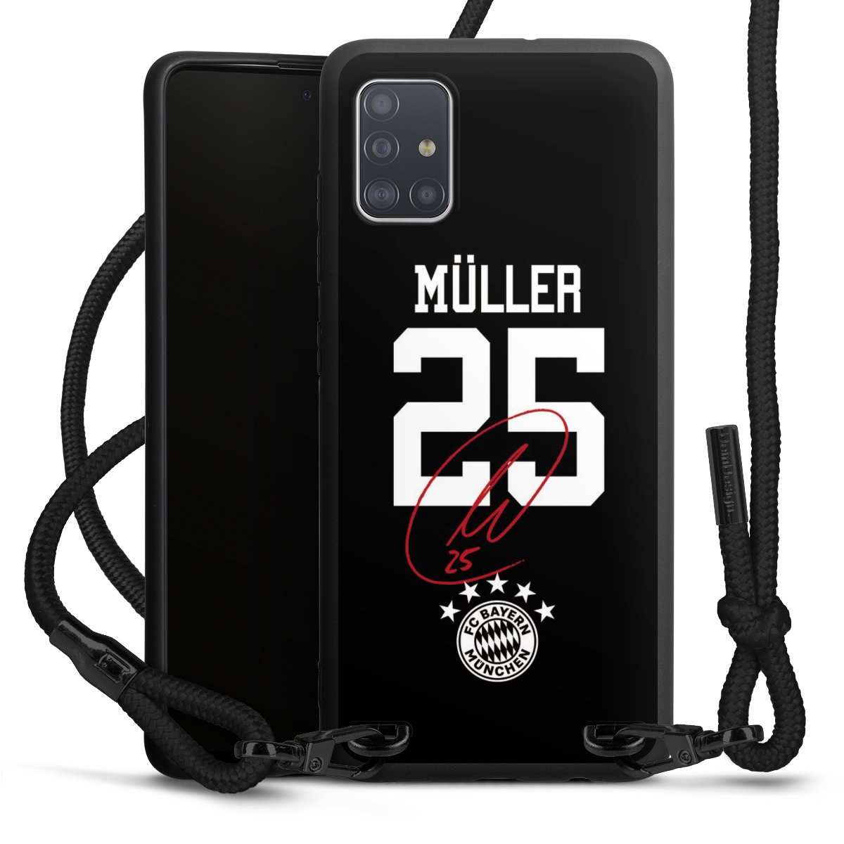 The matt black silicone case is made of flexible TPU (thermoplastic polyurethane) and offers robust protection. The durable, unbreakable material makes the cover flexible and dimensionally stable at the same time. The matte surface makes your design stand out more and is less susceptible to fingerprints and dirt. The stylish trend accessory fits comfortably in the hand and is perfectly complemented by the fabric (polyester) mobile phone strap. The braided fabric strap is approx. 1.70 metres long with a diameter of approx. 0.5 cm. Due to the special knotting technique, the length of the strap can be adjusted by simply pulling it, so that you can adapt it individually to your wishes. The practical case to wear around your neck is available with the fabric strap in black. As a little icing on the cake, we have provided the strap with a chic metal fastener in matt black. The strap is securely fastened to the case with loops made of high-quality genuine leather and press studs. The ends of the fabric strap are covered with metallic end caps and thus protected from fraying.