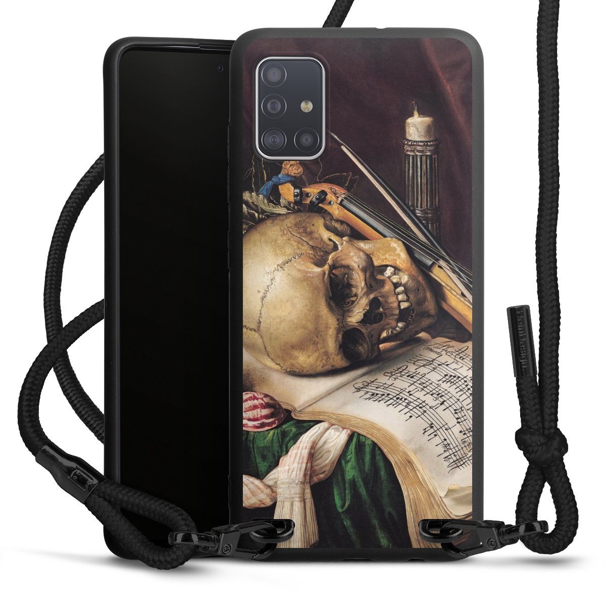 The matt black silicone case is made of flexible TPU (thermoplastic polyurethane) and offers robust protection. The durable, unbreakable material makes the cover flexible and dimensionally stable at the same time. The matte surface makes your design stand out more and is less susceptible to fingerprints and dirt. The stylish trend accessory fits comfortably in the hand and is perfectly complemented by the fabric (polyester) mobile phone strap. The braided fabric strap is approx. 1.70 metres long with a diameter of approx. 0.5 cm. Due to the special knotting technique, the length of the strap can be adjusted by simply pulling it, so that you can adapt it individually to your wishes. The practical case to wear around your neck is available with the fabric strap in black. As a little icing on the cake, we have provided the strap with a chic metal fastener in matt black. The strap is securely fastened to the case with loops made of high-quality genuine leather and press studs. The ends of the fabric strap are covered with metallic end caps and thus protected from fraying.