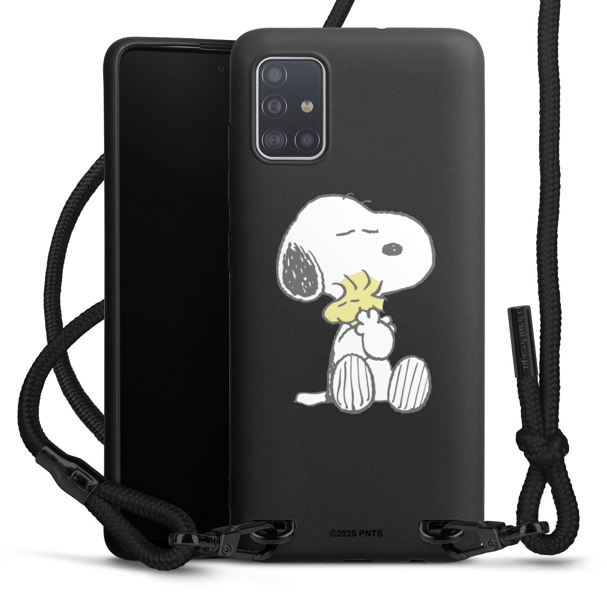 The matt black silicone case is made of flexible TPU (thermoplastic polyurethane) and offers robust protection. The durable, unbreakable material makes the cover flexible and dimensionally stable at the same time. The matte surface makes your design stand out more and is less susceptible to fingerprints and dirt. The stylish trend accessory fits comfortably in the hand and is perfectly complemented by the fabric (polyester) mobile phone strap. The braided fabric strap is approx. 1.70 metres long with a diameter of approx. 0.5 cm. Due to the special knotting technique, the length of the strap can be adjusted by simply pulling it, so that you can adapt it individually to your wishes. The practical case to wear around your neck is available with the fabric strap in black. As a little icing on the cake, we have provided the strap with a chic metal fastener in matt black. The strap is securely fastened to the case with loops made of high-quality genuine leather and press studs. The ends of the fabric strap are covered with metallic end caps and thus protected from fraying.