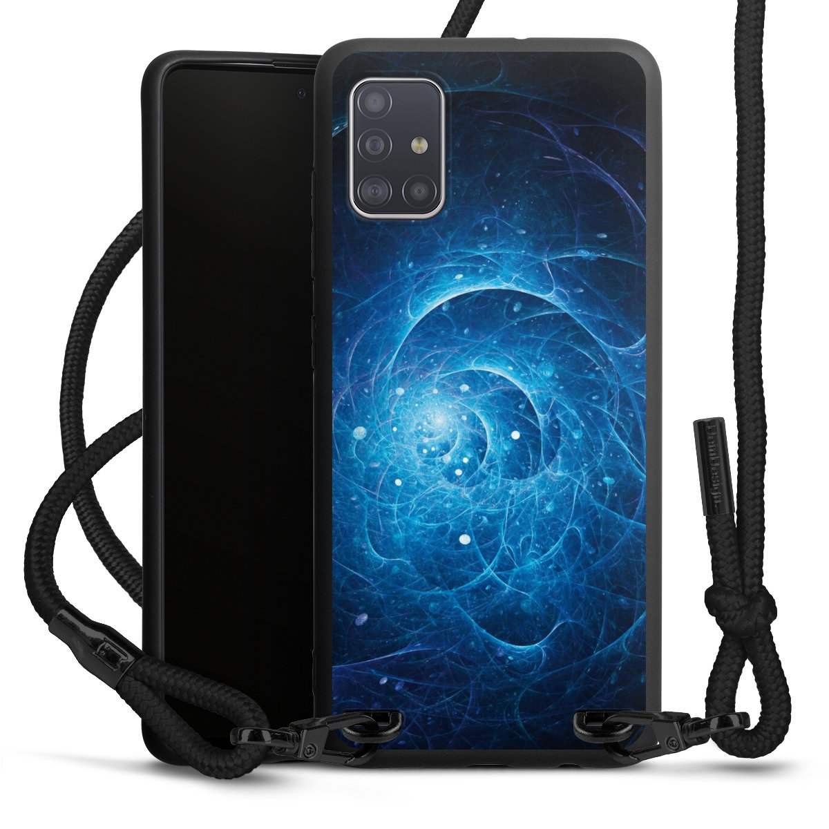 The matt black silicone case is made of flexible TPU (thermoplastic polyurethane) and offers robust protection. The durable, unbreakable material makes the cover flexible and dimensionally stable at the same time. The matte surface makes your design stand out more and is less susceptible to fingerprints and dirt. The stylish trend accessory fits comfortably in the hand and is perfectly complemented by the fabric (polyester) mobile phone strap. The braided fabric strap is approx. 1.70 metres long with a diameter of approx. 0.5 cm. Due to the special knotting technique, the length of the strap can be adjusted by simply pulling it, so that you can adapt it individually to your wishes. The practical case to wear around your neck is available with the fabric strap in black. As a little icing on the cake, we have provided the strap with a chic metal fastener in matt black. The strap is securely fastened to the case with loops made of high-quality genuine leather and press studs. The ends of the fabric strap are covered with metallic end caps and thus protected from fraying.