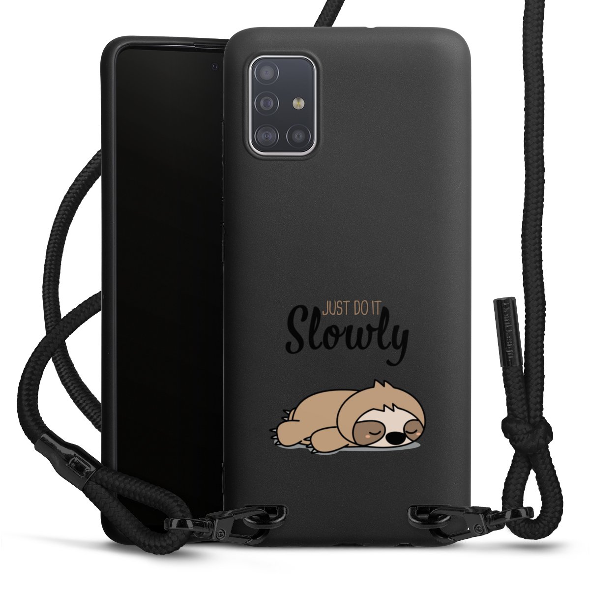 The matt black silicone case is made of flexible TPU (thermoplastic polyurethane) and offers robust protection. The durable, unbreakable material makes the cover flexible and dimensionally stable at the same time. The matte surface makes your design stand out more and is less susceptible to fingerprints and dirt. The stylish trend accessory fits comfortably in the hand and is perfectly complemented by the fabric (polyester) mobile phone strap. The braided fabric strap is approx. 1.70 metres long with a diameter of approx. 0.5 cm. Due to the special knotting technique, the length of the strap can be adjusted by simply pulling it, so that you can adapt it individually to your wishes. The practical case to wear around your neck is available with the fabric strap in black. As a little icing on the cake, we have provided the strap with a chic metal fastener in matt black. The strap is securely fastened to the case with loops made of high-quality genuine leather and press studs. The ends of the fabric strap are covered with metallic end caps and thus protected from fraying.