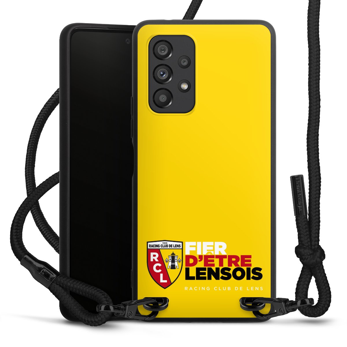 The matt black silicone case is made of flexible TPU (thermoplastic polyurethane) and offers robust protection. The durable, unbreakable material makes the cover flexible and dimensionally stable at the same time. The matte surface makes your design stand out more and is less susceptible to fingerprints and dirt. The stylish trend accessory fits comfortably in the hand and is perfectly complemented by the fabric (polyester) mobile phone strap. The braided fabric strap is approx. 1.70 metres long with a diameter of approx. 0.5 cm. Due to the special knotting technique, the length of the strap can be adjusted by simply pulling it, so that you can adapt it individually to your wishes. The practical case to wear around your neck is available with the fabric strap in black. As a little icing on the cake, we have provided the strap with a chic metal fastener in matt black. The strap is securely fastened to the case with loops made of high-quality genuine leather and press studs. The ends of the fabric strap are covered with metallic end caps and thus protected from fraying.