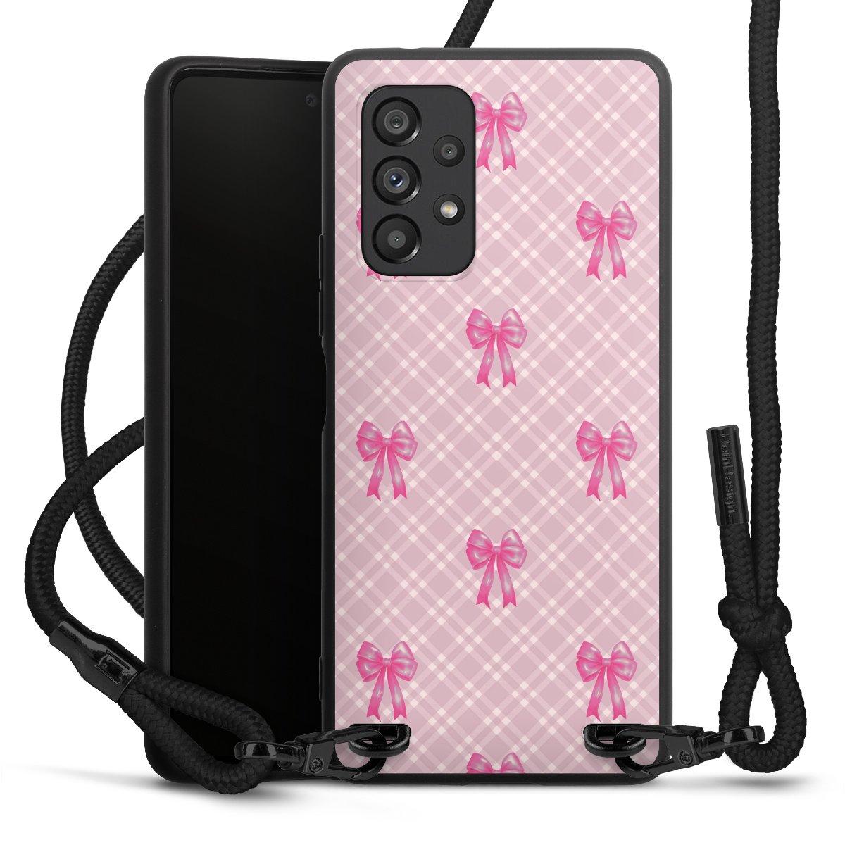 The matt black silicone case is made of flexible TPU (thermoplastic polyurethane) and offers robust protection. The durable, unbreakable material makes the cover flexible and dimensionally stable at the same time. The matte surface makes your design stand out more and is less susceptible to fingerprints and dirt. The stylish trend accessory fits comfortably in the hand and is perfectly complemented by the fabric (polyester) mobile phone strap. The braided fabric strap is approx. 1.70 metres long with a diameter of approx. 0.5 cm. Due to the special knotting technique, the length of the strap can be adjusted by simply pulling it, so that you can adapt it individually to your wishes. The practical case to wear around your neck is available with the fabric strap in black. As a little icing on the cake, we have provided the strap with a chic metal fastener in matt black. The strap is securely fastened to the case with loops made of high-quality genuine leather and press studs. The ends of the fabric strap are covered with metallic end caps and thus protected from fraying.