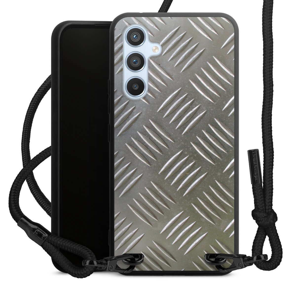 Pure Black: Phone case, fabric strap and metal details in stylish matt black.