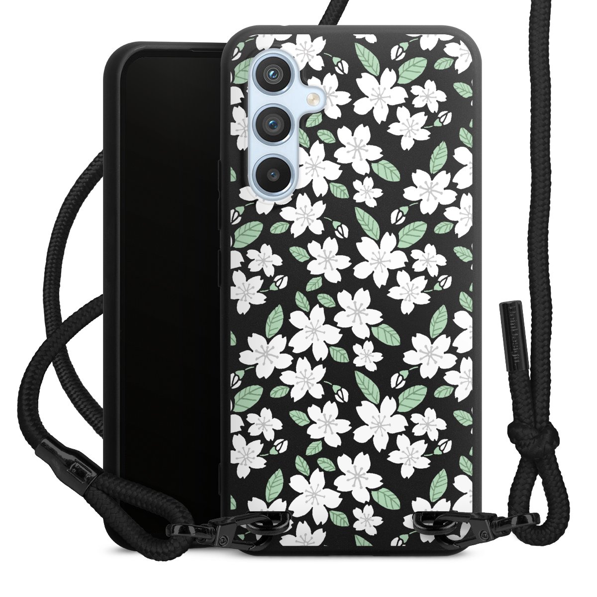 The matt black silicone case is made of flexible TPU (thermoplastic polyurethane) and offers robust protection. The durable, unbreakable material makes the cover flexible and dimensionally stable at the same time. The matte surface makes your design stand out more and is less susceptible to fingerprints and dirt. The stylish trend accessory fits comfortably in the hand and is perfectly complemented by the fabric (polyester) mobile phone strap. The braided fabric strap is approx. 1.70 metres long with a diameter of approx. 0.5 cm. Due to the special knotting technique, the length of the strap can be adjusted by simply pulling it, so that you can adapt it individually to your wishes. The practical case to wear around your neck is available with the fabric strap in black. As a little icing on the cake, we have provided the strap with a chic metal fastener in matt black. The strap is securely fastened to the case with loops made of high-quality genuine leather and press studs. The ends of the fabric strap are covered with metallic end caps and thus protected from fraying.
