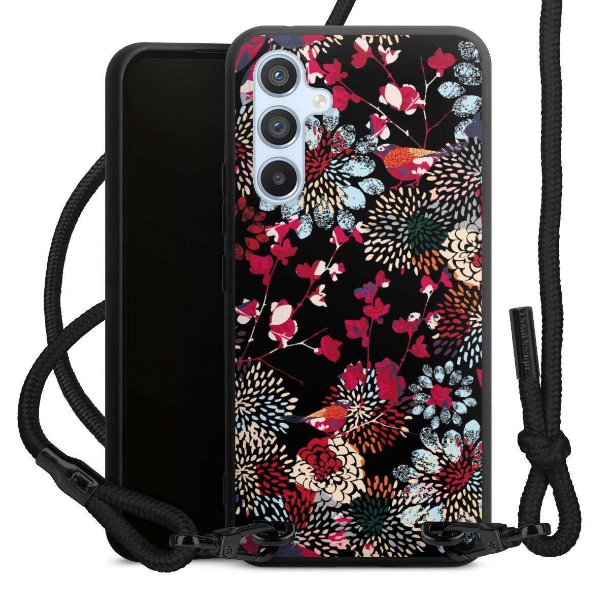 The matt black silicone case is made of flexible TPU (thermoplastic polyurethane) and offers robust protection. The durable, unbreakable material makes the cover flexible and dimensionally stable at the same time. The matte surface makes your design stand out more and is less susceptible to fingerprints and dirt. The stylish trend accessory fits comfortably in the hand and is perfectly complemented by the fabric (polyester) mobile phone strap. The braided fabric strap is approx. 1.70 metres long with a diameter of approx. 0.5 cm. Due to the special knotting technique, the length of the strap can be adjusted by simply pulling it, so that you can adapt it individually to your wishes. The practical case to wear around your neck is available with the fabric strap in black. As a little icing on the cake, we have provided the strap with a chic metal fastener in matt black. The strap is securely fastened to the case with loops made of high-quality genuine leather and press studs. The ends of the fabric strap are covered with metallic end caps and thus protected from fraying.