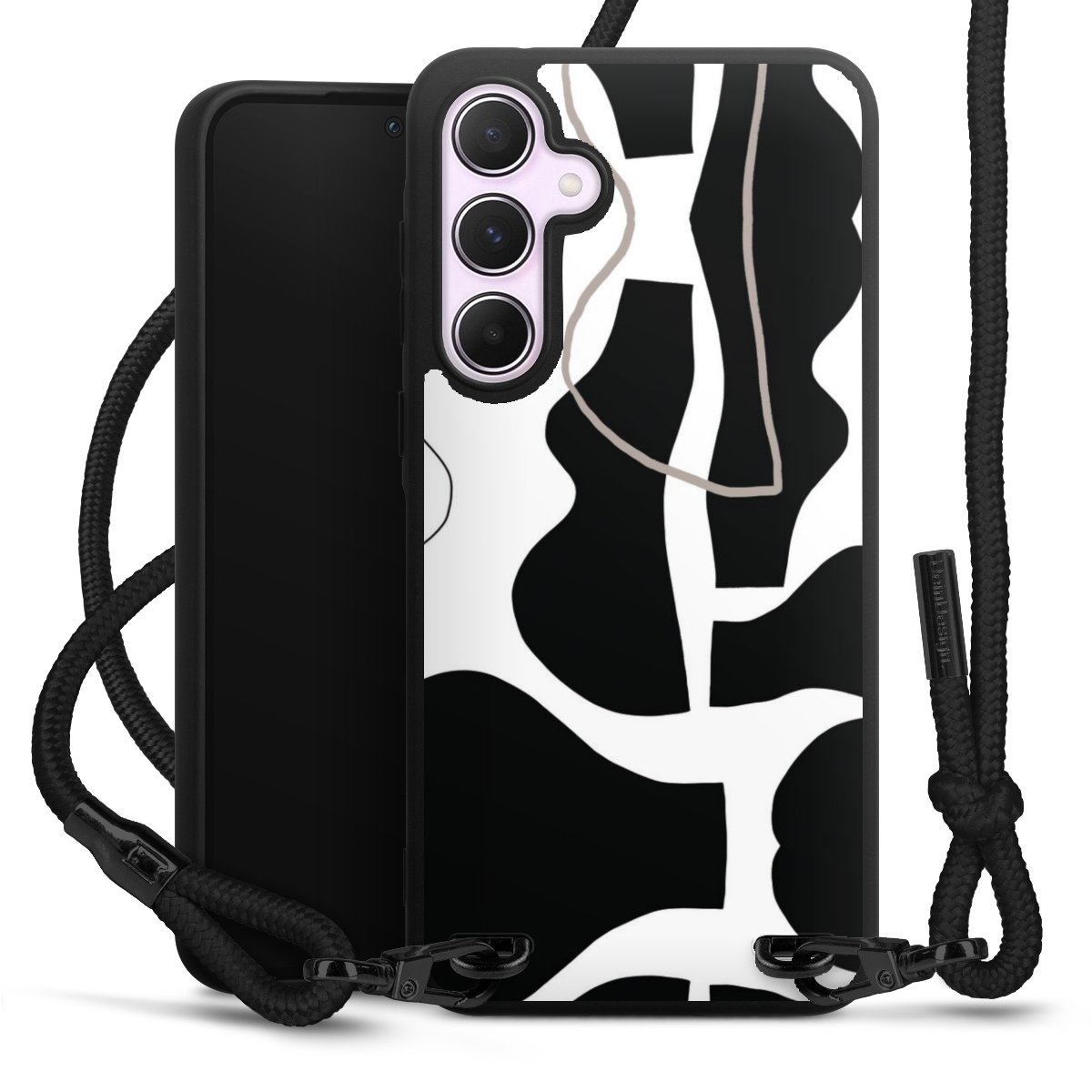 The matt black silicone case is made of flexible TPU (thermoplastic polyurethane) and offers robust protection. The durable, unbreakable material makes the cover flexible and dimensionally stable at the same time. The matte surface makes your design stand out more and is less susceptible to fingerprints and dirt. The stylish trend accessory fits comfortably in the hand and is perfectly complemented by the fabric (polyester) mobile phone strap. The braided fabric strap is approx. 1.70 metres long with a diameter of approx. 0.5 cm. Due to the special knotting technique, the length of the strap can be adjusted by simply pulling it, so that you can adapt it individually to your wishes. The practical case to wear around your neck is available with the fabric strap in black. As a little icing on the cake, we have provided the strap with a chic metal fastener in matt black. The strap is securely fastened to the case with loops made of high-quality genuine leather and press studs. The ends of the fabric strap are covered with metallic end caps and thus protected from fraying.