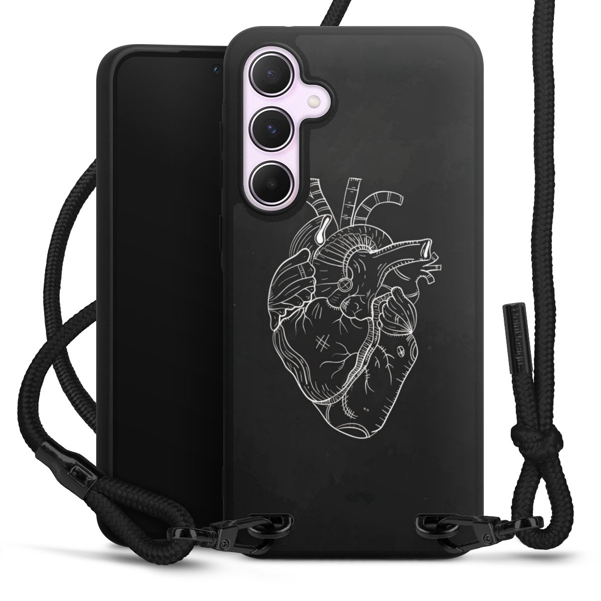 The matt black silicone case is made of flexible TPU (thermoplastic polyurethane) and offers robust protection. The durable, unbreakable material makes the cover flexible and dimensionally stable at the same time. The matte surface makes your design stand out more and is less susceptible to fingerprints and dirt. The stylish trend accessory fits comfortably in the hand and is perfectly complemented by the fabric (polyester) mobile phone strap. The braided fabric strap is approx. 1.70 metres long with a diameter of approx. 0.5 cm. Due to the special knotting technique, the length of the strap can be adjusted by simply pulling it, so that you can adapt it individually to your wishes. The practical case to wear around your neck is available with the fabric strap in black. As a little icing on the cake, we have provided the strap with a chic metal fastener in matt black. The strap is securely fastened to the case with loops made of high-quality genuine leather and press studs. The ends of the fabric strap are covered with metallic end caps and thus protected from fraying.