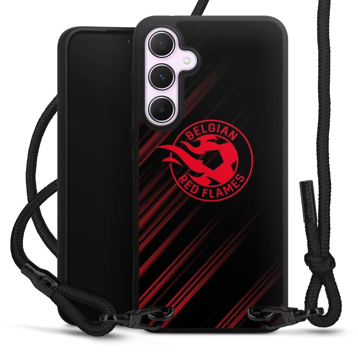 The matt black silicone case is made of flexible TPU (thermoplastic polyurethane) and offers robust protection. The durable, unbreakable material makes the cover flexible and dimensionally stable at the same time. The matte surface makes your design stand out more and is less susceptible to fingerprints and dirt. The stylish trend accessory fits comfortably in the hand and is perfectly complemented by the fabric (polyester) mobile phone strap. The braided fabric strap is approx. 1.70 metres long with a diameter of approx. 0.5 cm. Due to the special knotting technique, the length of the strap can be adjusted by simply pulling it, so that you can adapt it individually to your wishes. The practical case to wear around your neck is available with the fabric strap in black. As a little icing on the cake, we have provided the strap with a chic metal fastener in matt black. The strap is securely fastened to the case with loops made of high-quality genuine leather and press studs. The ends of the fabric strap are covered with metallic end caps and thus protected from fraying.