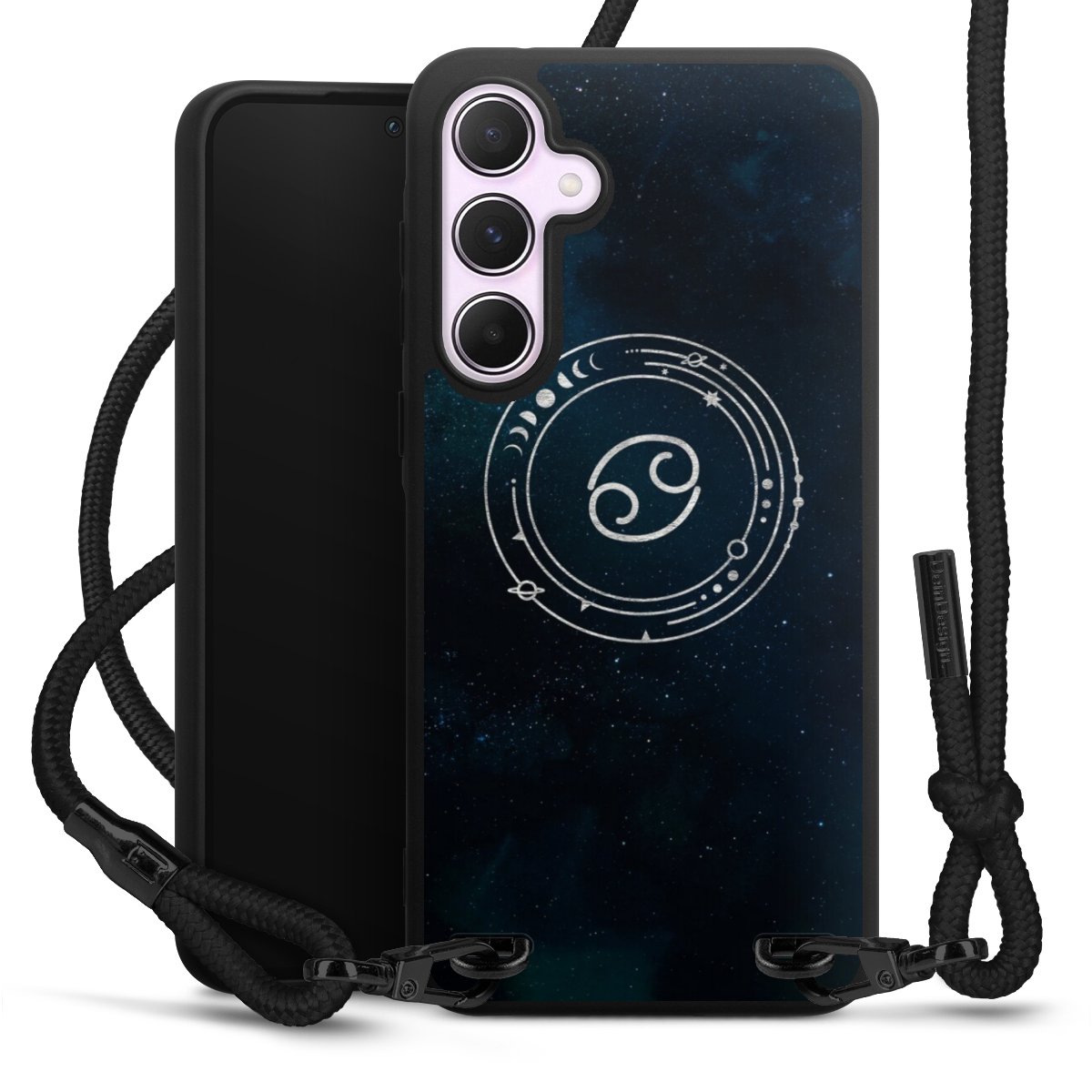 The matt black silicone case is made of flexible TPU (thermoplastic polyurethane) and offers robust protection. The durable, unbreakable material makes the cover flexible and dimensionally stable at the same time. The matte surface makes your design stand out more and is less susceptible to fingerprints and dirt. The stylish trend accessory fits comfortably in the hand and is perfectly complemented by the fabric (polyester) mobile phone strap. The braided fabric strap is approx. 1.70 metres long with a diameter of approx. 0.5 cm. Due to the special knotting technique, the length of the strap can be adjusted by simply pulling it, so that you can adapt it individually to your wishes. The practical case to wear around your neck is available with the fabric strap in black. As a little icing on the cake, we have provided the strap with a chic metal fastener in matt black. The strap is securely fastened to the case with loops made of high-quality genuine leather and press studs. The ends of the fabric strap are covered with metallic end caps and thus protected from fraying.