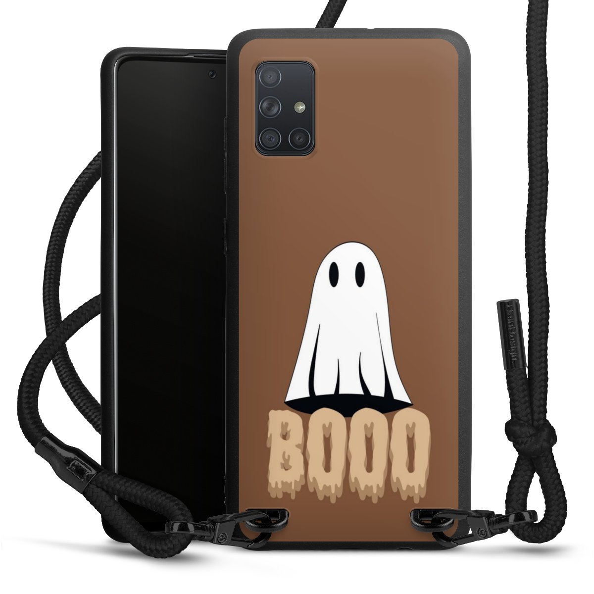 The matt black silicone case is made of flexible TPU (thermoplastic polyurethane) and offers robust protection. The durable, unbreakable material makes the cover flexible and dimensionally stable at the same time. The matte surface makes your design stand out more and is less susceptible to fingerprints and dirt. The stylish trend accessory fits comfortably in the hand and is perfectly complemented by the fabric (polyester) mobile phone strap. The braided fabric strap is approx. 1.70 metres long with a diameter of approx. 0.5 cm. Due to the special knotting technique, the length of the strap can be adjusted by simply pulling it, so that you can adapt it individually to your wishes. The practical case to wear around your neck is available with the fabric strap in black. As a little icing on the cake, we have provided the strap with a chic metal fastener in matt black. The strap is securely fastened to the case with loops made of high-quality genuine leather and press studs. The ends of the fabric strap are covered with metallic end caps and thus protected from fraying.