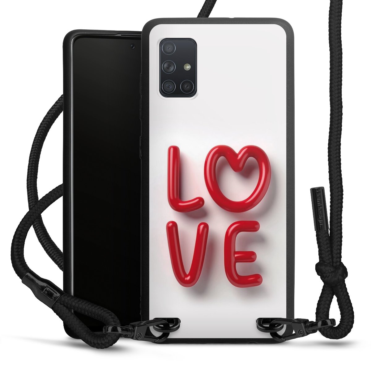 The matt black silicone case is made of flexible TPU (thermoplastic polyurethane) and offers robust protection. The durable, unbreakable material makes the cover flexible and dimensionally stable at the same time. The matte surface makes your design stand out more and is less susceptible to fingerprints and dirt. The stylish trend accessory fits comfortably in the hand and is perfectly complemented by the fabric (polyester) mobile phone strap. The braided fabric strap is approx. 1.70 metres long with a diameter of approx. 0.5 cm. Due to the special knotting technique, the length of the strap can be adjusted by simply pulling it, so that you can adapt it individually to your wishes. The practical case to wear around your neck is available with the fabric strap in black. As a little icing on the cake, we have provided the strap with a chic metal fastener in matt black. The strap is securely fastened to the case with loops made of high-quality genuine leather and press studs. The ends of the fabric strap are covered with metallic end caps and thus protected from fraying.