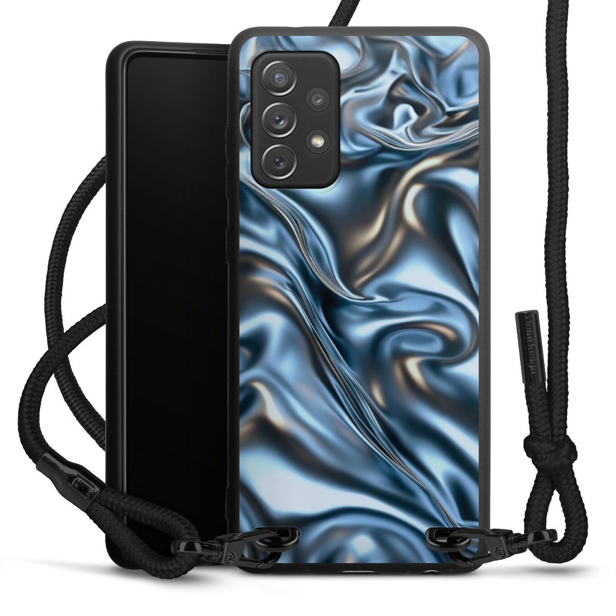 The matt black silicone case is made of flexible TPU (thermoplastic polyurethane) and offers robust protection. The durable, unbreakable material makes the cover flexible and dimensionally stable at the same time. The matte surface makes your design stand out more and is less susceptible to fingerprints and dirt. The stylish trend accessory fits comfortably in the hand and is perfectly complemented by the fabric (polyester) mobile phone strap. The braided fabric strap is approx. 1.70 metres long with a diameter of approx. 0.5 cm. Due to the special knotting technique, the length of the strap can be adjusted by simply pulling it, so that you can adapt it individually to your wishes. The practical case to wear around your neck is available with the fabric strap in black. As a little icing on the cake, we have provided the strap with a chic metal fastener in matt black. The strap is securely fastened to the case with loops made of high-quality genuine leather and press studs. The ends of the fabric strap are covered with metallic end caps and thus protected from fraying.
