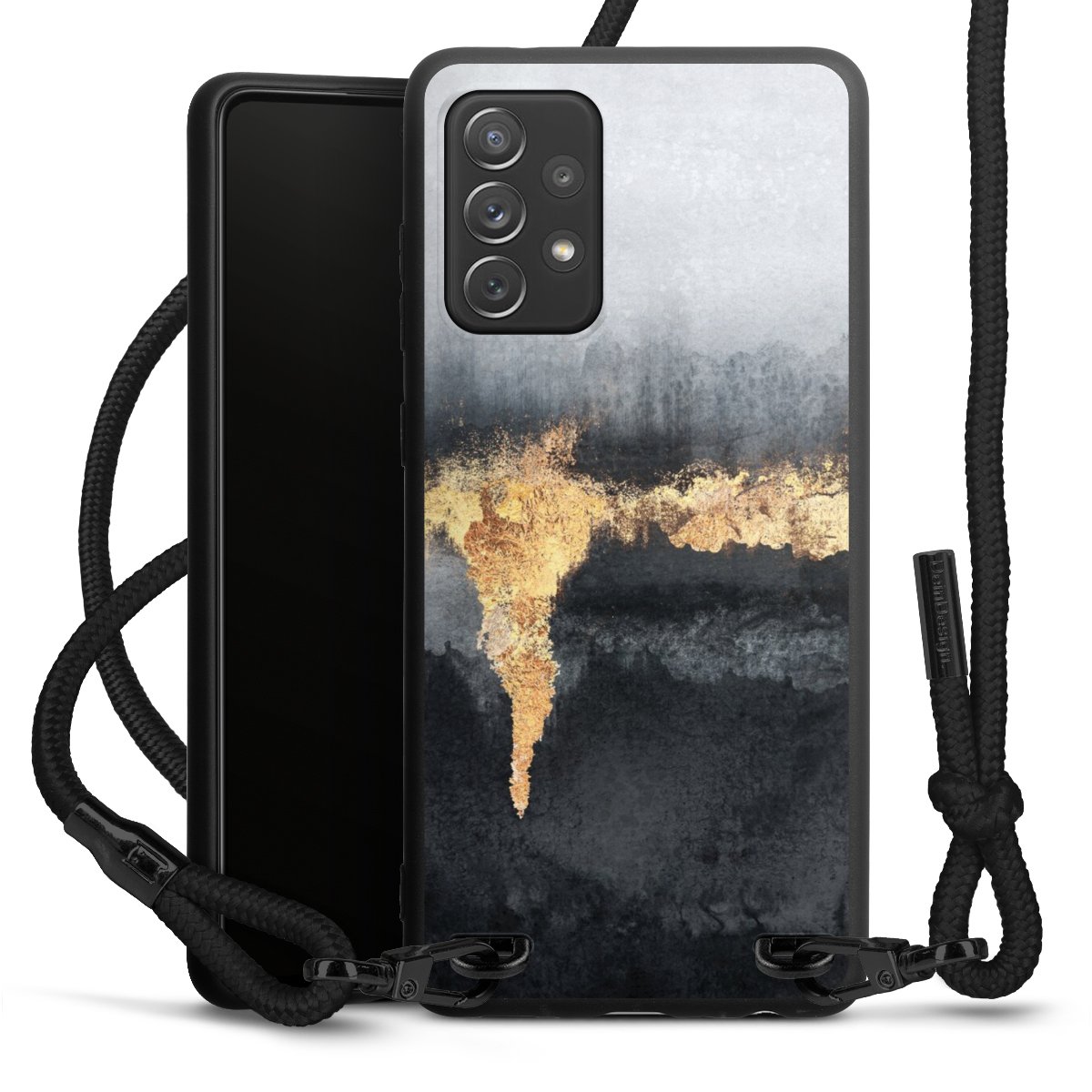 The matt black silicone case is made of flexible TPU (thermoplastic polyurethane) and offers robust protection. The durable, unbreakable material makes the cover flexible and dimensionally stable at the same time. The matte surface makes your design stand out more and is less susceptible to fingerprints and dirt. The stylish trend accessory fits comfortably in the hand and is perfectly complemented by the fabric (polyester) mobile phone strap. The braided fabric strap is approx. 1.70 metres long with a diameter of approx. 0.5 cm. Due to the special knotting technique, the length of the strap can be adjusted by simply pulling it, so that you can adapt it individually to your wishes. The practical case to wear around your neck is available with the fabric strap in black. As a little icing on the cake, we have provided the strap with a chic metal fastener in matt black. The strap is securely fastened to the case with loops made of high-quality genuine leather and press studs. The ends of the fabric strap are covered with metallic end caps and thus protected from fraying.