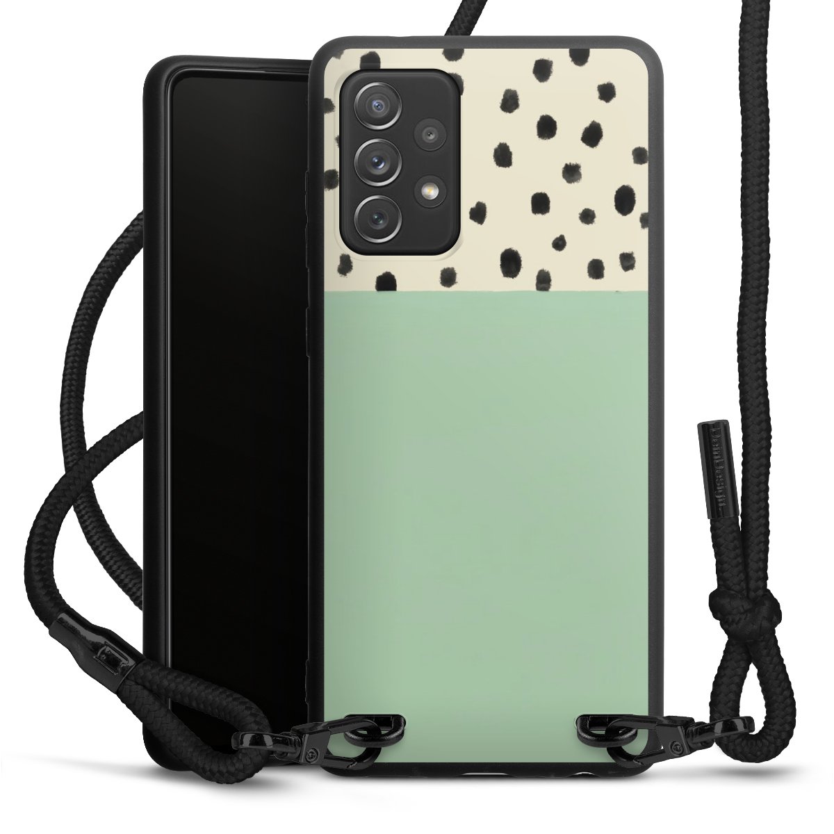 The matt black silicone case is made of flexible TPU (thermoplastic polyurethane) and offers robust protection. The durable, unbreakable material makes the cover flexible and dimensionally stable at the same time. The matte surface makes your design stand out more and is less susceptible to fingerprints and dirt. The stylish trend accessory fits comfortably in the hand and is perfectly complemented by the fabric (polyester) mobile phone strap. The braided fabric strap is approx. 1.70 metres long with a diameter of approx. 0.5 cm. Due to the special knotting technique, the length of the strap can be adjusted by simply pulling it, so that you can adapt it individually to your wishes. The practical case to wear around your neck is available with the fabric strap in black. As a little icing on the cake, we have provided the strap with a chic metal fastener in matt black. The strap is securely fastened to the case with loops made of high-quality genuine leather and press studs. The ends of the fabric strap are covered with metallic end caps and thus protected from fraying.