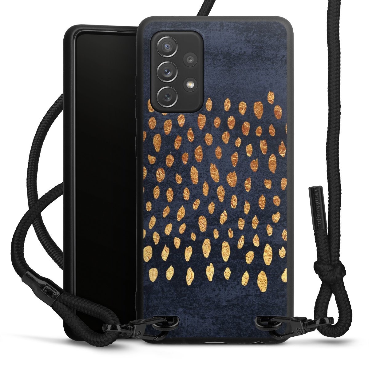 The matt black silicone case is made of flexible TPU (thermoplastic polyurethane) and offers robust protection. The durable, unbreakable material makes the cover flexible and dimensionally stable at the same time. The matte surface makes your design stand out more and is less susceptible to fingerprints and dirt. The stylish trend accessory fits comfortably in the hand and is perfectly complemented by the fabric (polyester) mobile phone strap. The braided fabric strap is approx. 1.70 metres long with a diameter of approx. 0.5 cm. Due to the special knotting technique, the length of the strap can be adjusted by simply pulling it, so that you can adapt it individually to your wishes. The practical case to wear around your neck is available with the fabric strap in black. As a little icing on the cake, we have provided the strap with a chic metal fastener in matt black. The strap is securely fastened to the case with loops made of high-quality genuine leather and press studs. The ends of the fabric strap are covered with metallic end caps and thus protected from fraying.