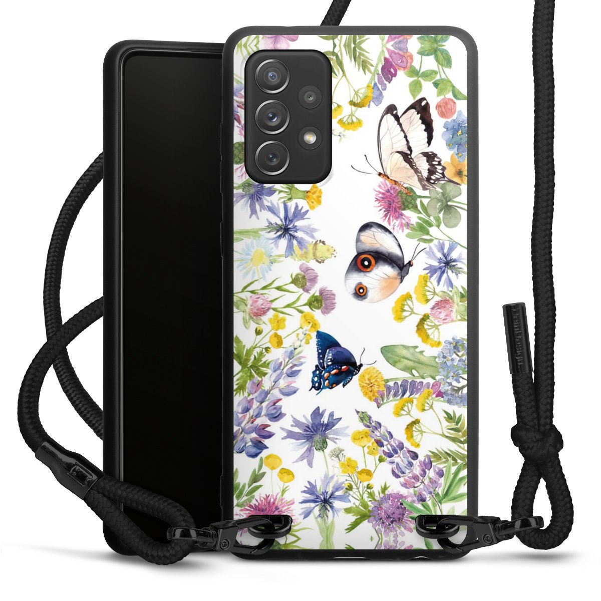 The matt black silicone case is made of flexible TPU (thermoplastic polyurethane) and offers robust protection. The durable, unbreakable material makes the cover flexible and dimensionally stable at the same time. The matte surface makes your design stand out more and is less susceptible to fingerprints and dirt. The stylish trend accessory fits comfortably in the hand and is perfectly complemented by the fabric (polyester) mobile phone strap. The braided fabric strap is approx. 1.70 metres long with a diameter of approx. 0.5 cm. Due to the special knotting technique, the length of the strap can be adjusted by simply pulling it, so that you can adapt it individually to your wishes. The practical case to wear around your neck is available with the fabric strap in black. As a little icing on the cake, we have provided the strap with a chic metal fastener in matt black. The strap is securely fastened to the case with loops made of high-quality genuine leather and press studs. The ends of the fabric strap are covered with metallic end caps and thus protected from fraying.