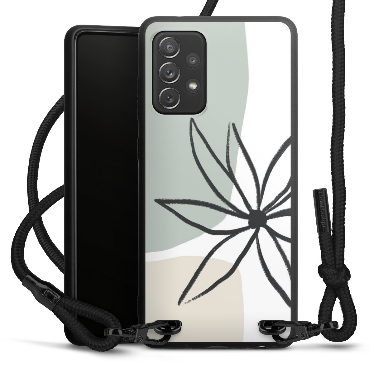 The matt black silicone case is made of flexible TPU (thermoplastic polyurethane) and offers robust protection. The durable, unbreakable material makes the cover flexible and dimensionally stable at the same time. The matte surface makes your design stand out more and is less susceptible to fingerprints and dirt. The stylish trend accessory fits comfortably in the hand and is perfectly complemented by the fabric (polyester) mobile phone strap. The braided fabric strap is approx. 1.70 metres long with a diameter of approx. 0.5 cm. Due to the special knotting technique, the length of the strap can be adjusted by simply pulling it, so that you can adapt it individually to your wishes. The practical case to wear around your neck is available with the fabric strap in black. As a little icing on the cake, we have provided the strap with a chic metal fastener in matt black. The strap is securely fastened to the case with loops made of high-quality genuine leather and press studs. The ends of the fabric strap are covered with metallic end caps and thus protected from fraying.