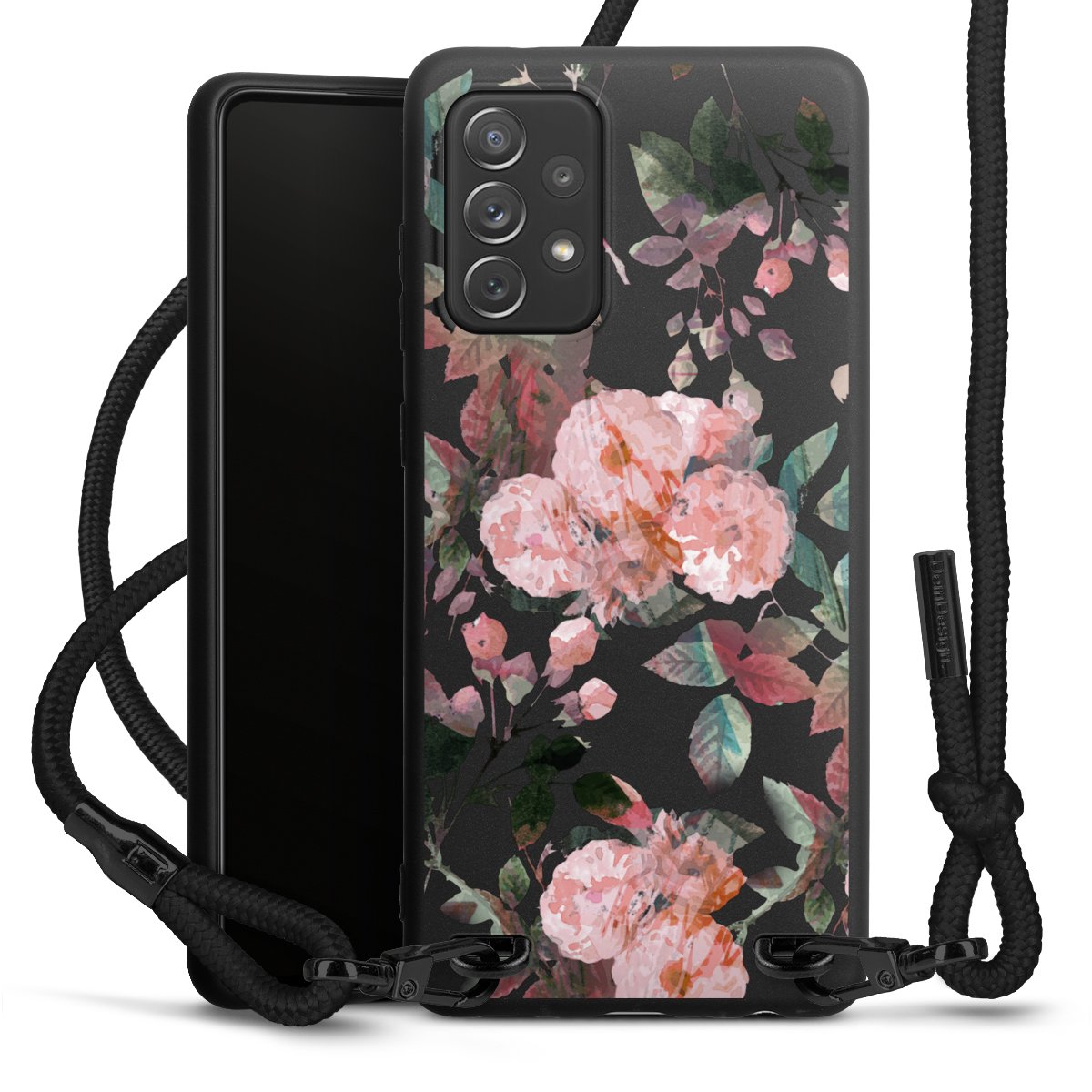 The matt black silicone case is made of flexible TPU (thermoplastic polyurethane) and offers robust protection. The durable, unbreakable material makes the cover flexible and dimensionally stable at the same time. The matte surface makes your design stand out more and is less susceptible to fingerprints and dirt. The stylish trend accessory fits comfortably in the hand and is perfectly complemented by the fabric (polyester) mobile phone strap. The braided fabric strap is approx. 1.70 metres long with a diameter of approx. 0.5 cm. Due to the special knotting technique, the length of the strap can be adjusted by simply pulling it, so that you can adapt it individually to your wishes. The practical case to wear around your neck is available with the fabric strap in black. As a little icing on the cake, we have provided the strap with a chic metal fastener in matt black. The strap is securely fastened to the case with loops made of high-quality genuine leather and press studs. The ends of the fabric strap are covered with metallic end caps and thus protected from fraying.