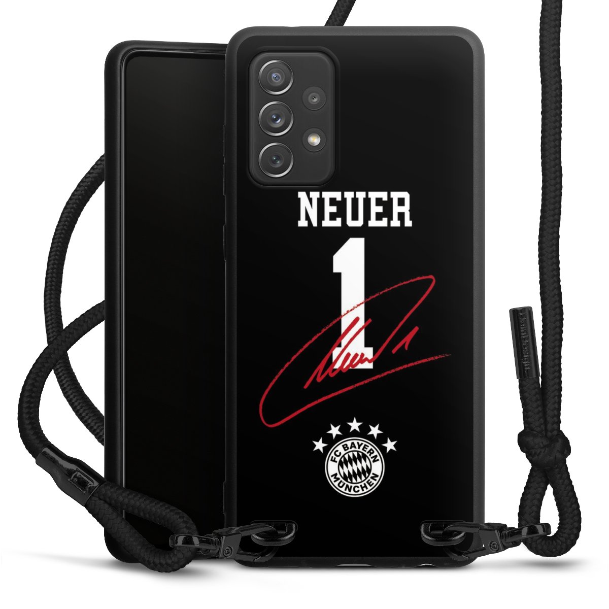 The matt black silicone case is made of flexible TPU (thermoplastic polyurethane) and offers robust protection. The durable, unbreakable material makes the cover flexible and dimensionally stable at the same time. The matte surface makes your design stand out more and is less susceptible to fingerprints and dirt. The stylish trend accessory fits comfortably in the hand and is perfectly complemented by the fabric (polyester) mobile phone strap. The braided fabric strap is approx. 1.70 metres long with a diameter of approx. 0.5 cm. Due to the special knotting technique, the length of the strap can be adjusted by simply pulling it, so that you can adapt it individually to your wishes. The practical case to wear around your neck is available with the fabric strap in black. As a little icing on the cake, we have provided the strap with a chic metal fastener in matt black. The strap is securely fastened to the case with loops made of high-quality genuine leather and press studs. The ends of the fabric strap are covered with metallic end caps and thus protected from fraying.