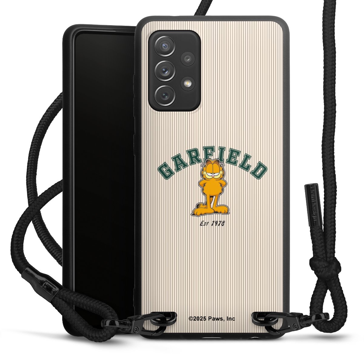 The matt black silicone case is made of flexible TPU (thermoplastic polyurethane) and offers robust protection. The durable, unbreakable material makes the cover flexible and dimensionally stable at the same time. The matte surface makes your design stand out more and is less susceptible to fingerprints and dirt. The stylish trend accessory fits comfortably in the hand and is perfectly complemented by the fabric (polyester) mobile phone strap. The braided fabric strap is approx. 1.70 metres long with a diameter of approx. 0.5 cm. Due to the special knotting technique, the length of the strap can be adjusted by simply pulling it, so that you can adapt it individually to your wishes. The practical case to wear around your neck is available with the fabric strap in black. As a little icing on the cake, we have provided the strap with a chic metal fastener in matt black. The strap is securely fastened to the case with loops made of high-quality genuine leather and press studs. The ends of the fabric strap are covered with metallic end caps and thus protected from fraying.