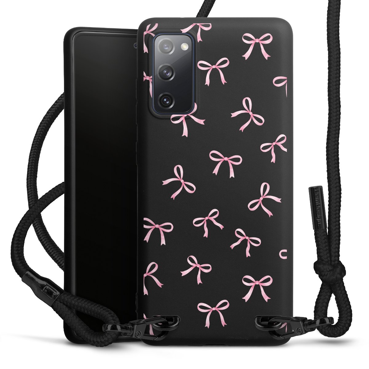 The matt black silicone case is made of flexible TPU (thermoplastic polyurethane) and offers robust protection. The durable, unbreakable material makes the cover flexible and dimensionally stable at the same time. The matte surface makes your design stand out more and is less susceptible to fingerprints and dirt. The stylish trend accessory fits comfortably in the hand and is perfectly complemented by the fabric (polyester) mobile phone strap. The braided fabric strap is approx. 1.70 metres long with a diameter of approx. 0.5 cm. Due to the special knotting technique, the length of the strap can be adjusted by simply pulling it, so that you can adapt it individually to your wishes. The practical case to wear around your neck is available with the fabric strap in black. As a little icing on the cake, we have provided the strap with a chic metal fastener in matt black. The strap is securely fastened to the case with loops made of high-quality genuine leather and press studs. The ends of the fabric strap are covered with metallic end caps and thus protected from fraying.