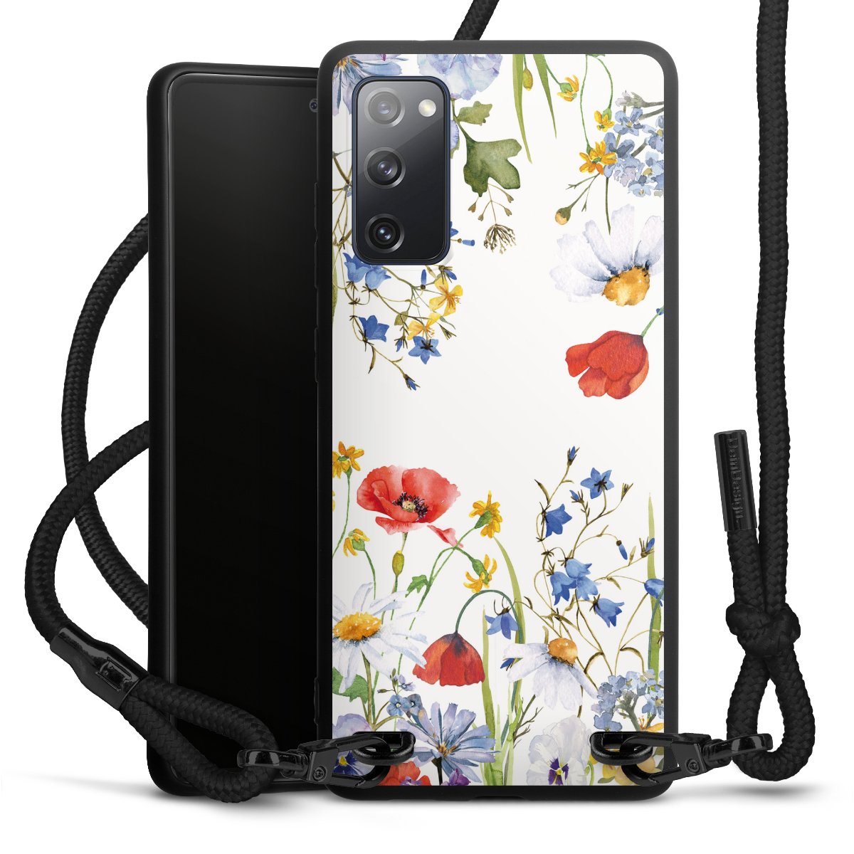 The matt black silicone case is made of flexible TPU (thermoplastic polyurethane) and offers robust protection. The durable, unbreakable material makes the cover flexible and dimensionally stable at the same time. The matte surface makes your design stand out more and is less susceptible to fingerprints and dirt. The stylish trend accessory fits comfortably in the hand and is perfectly complemented by the fabric (polyester) mobile phone strap. The braided fabric strap is approx. 1.70 metres long with a diameter of approx. 0.5 cm. Due to the special knotting technique, the length of the strap can be adjusted by simply pulling it, so that you can adapt it individually to your wishes. The practical case to wear around your neck is available with the fabric strap in black. As a little icing on the cake, we have provided the strap with a chic metal fastener in matt black. The strap is securely fastened to the case with loops made of high-quality genuine leather and press studs. The ends of the fabric strap are covered with metallic end caps and thus protected from fraying.