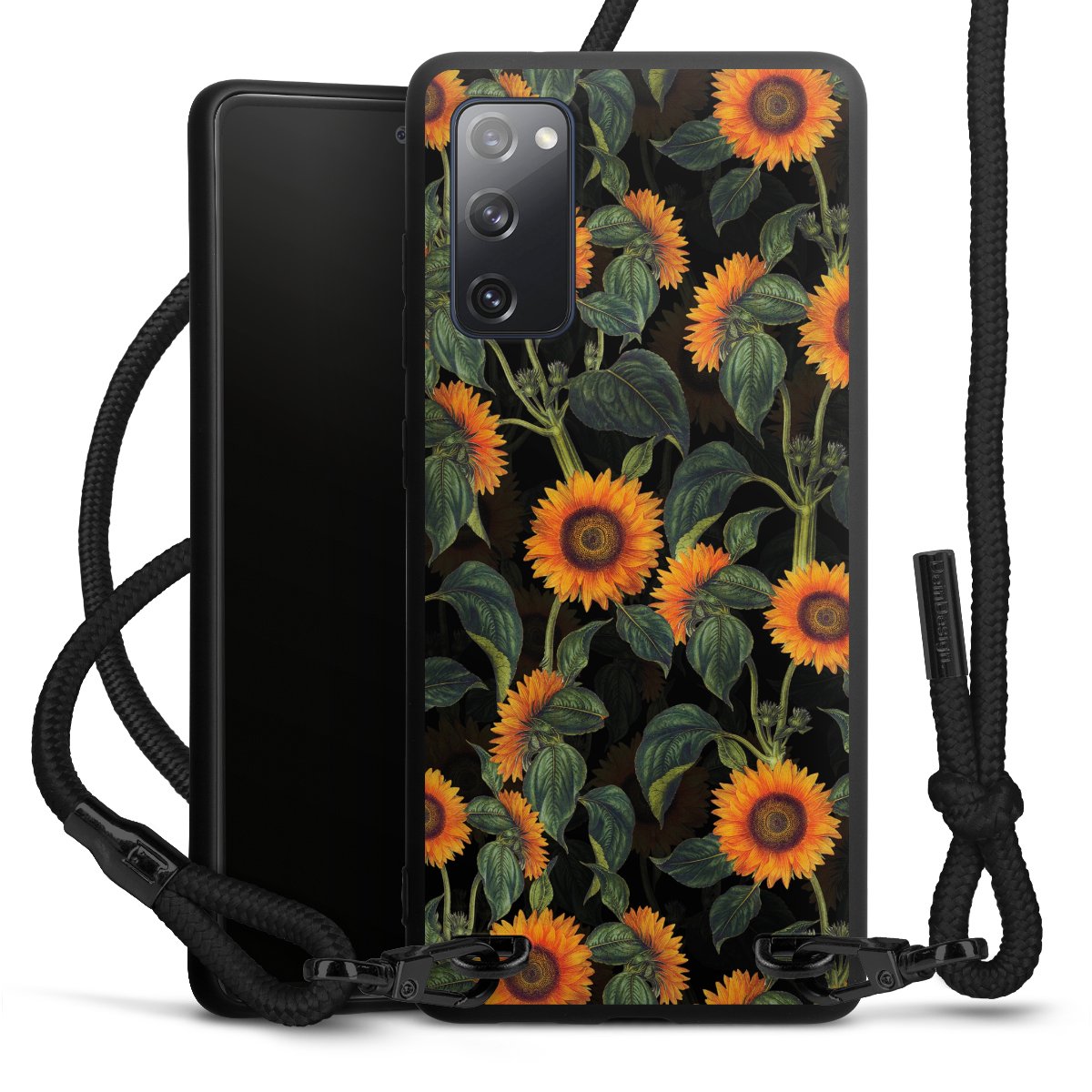 The matt black silicone case is made of flexible TPU (thermoplastic polyurethane) and offers robust protection. The durable, unbreakable material makes the cover flexible and dimensionally stable at the same time. The matte surface makes your design stand out more and is less susceptible to fingerprints and dirt. The stylish trend accessory fits comfortably in the hand and is perfectly complemented by the fabric (polyester) mobile phone strap. The braided fabric strap is approx. 1.70 metres long with a diameter of approx. 0.5 cm. Due to the special knotting technique, the length of the strap can be adjusted by simply pulling it, so that you can adapt it individually to your wishes. The practical case to wear around your neck is available with the fabric strap in black. As a little icing on the cake, we have provided the strap with a chic metal fastener in matt black. The strap is securely fastened to the case with loops made of high-quality genuine leather and press studs. The ends of the fabric strap are covered with metallic end caps and thus protected from fraying.
