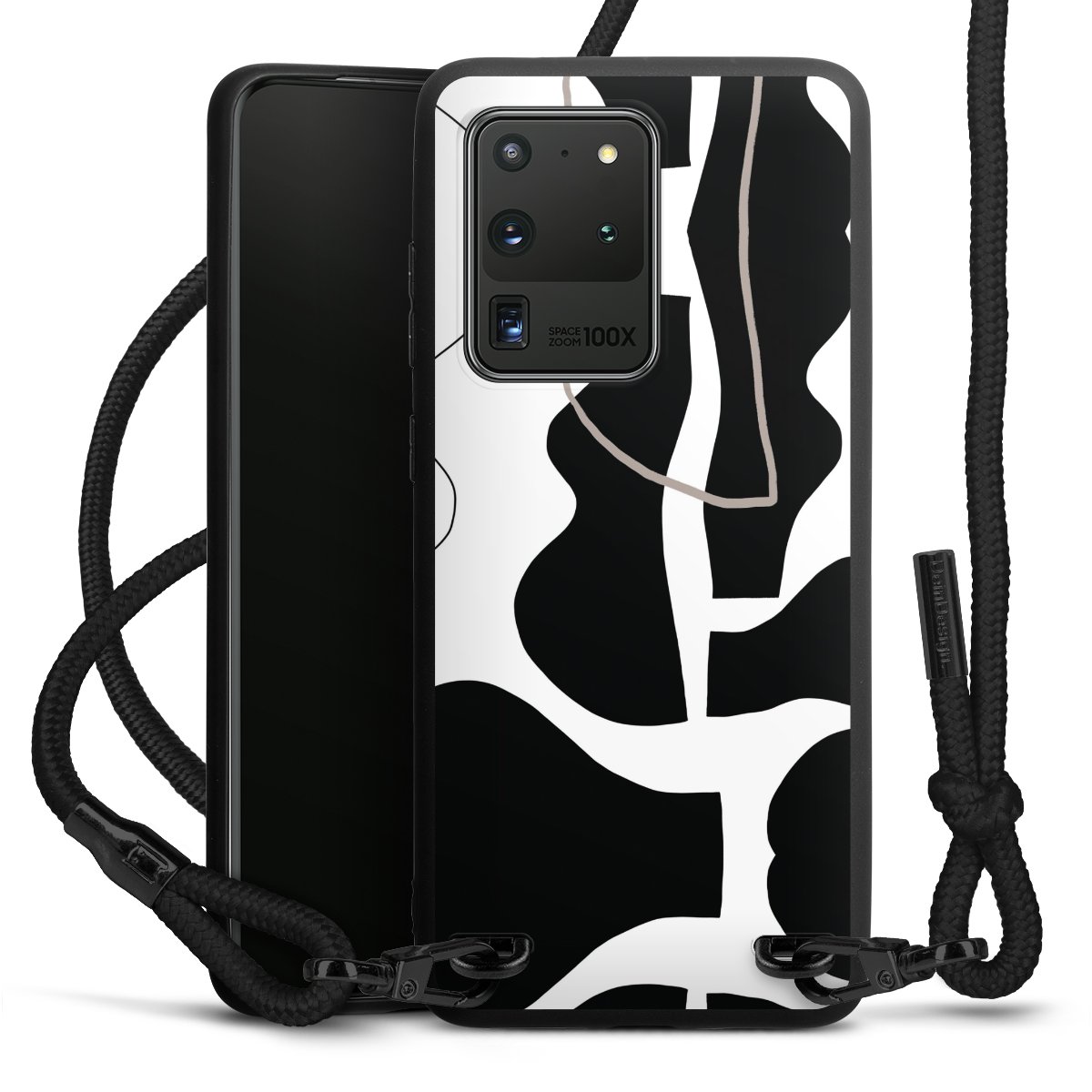 The matt black silicone case is made of flexible TPU (thermoplastic polyurethane) and offers robust protection. The durable, unbreakable material makes the cover flexible and dimensionally stable at the same time. The matte surface makes your design stand out more and is less susceptible to fingerprints and dirt. The stylish trend accessory fits comfortably in the hand and is perfectly complemented by the fabric (polyester) mobile phone strap. The braided fabric strap is approx. 1.70 metres long with a diameter of approx. 0.5 cm. Due to the special knotting technique, the length of the strap can be adjusted by simply pulling it, so that you can adapt it individually to your wishes. The practical case to wear around your neck is available with the fabric strap in black. As a little icing on the cake, we have provided the strap with a chic metal fastener in matt black. The strap is securely fastened to the case with loops made of high-quality genuine leather and press studs. The ends of the fabric strap are covered with metallic end caps and thus protected from fraying.