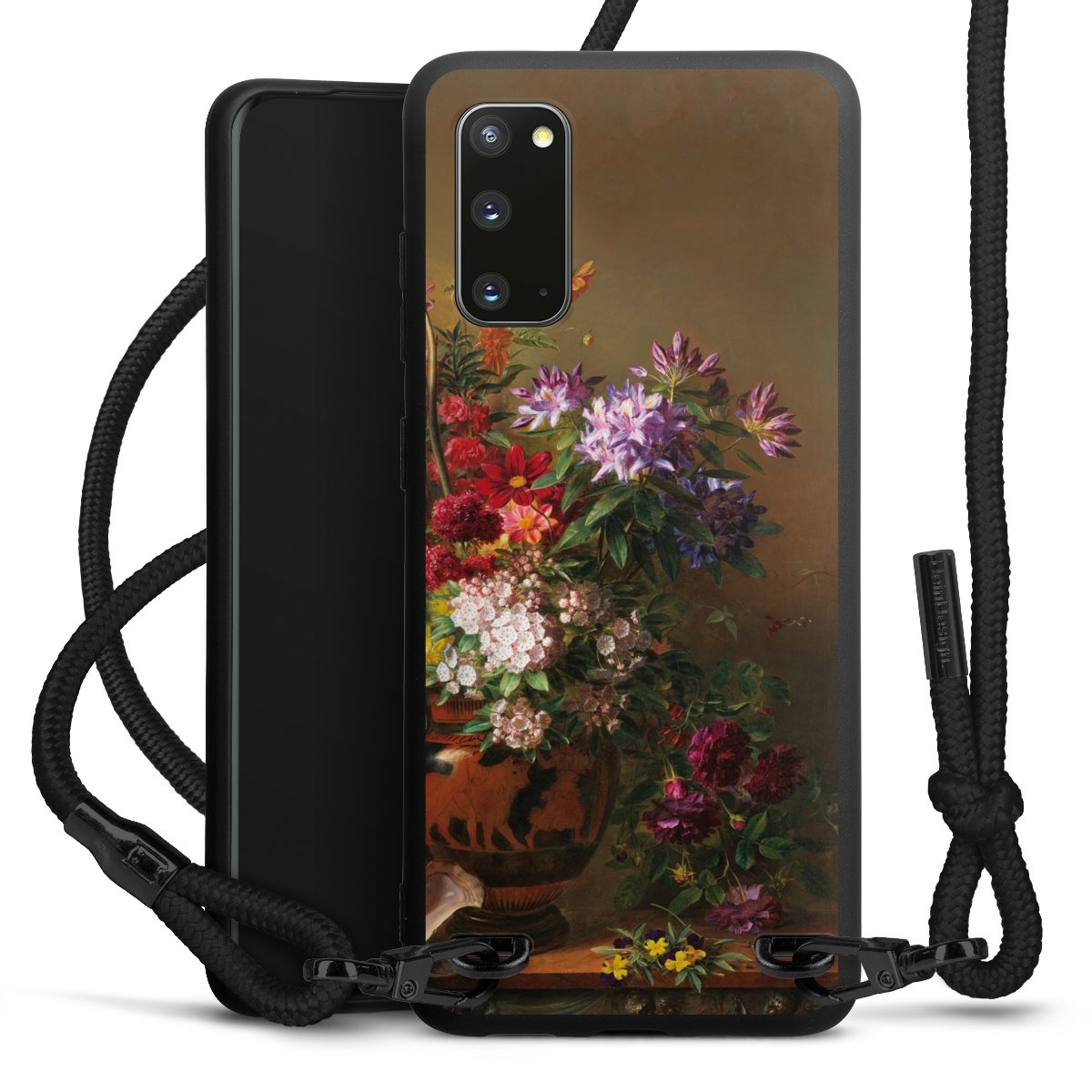 The matt black silicone case is made of flexible TPU (thermoplastic polyurethane) and offers robust protection. The durable, unbreakable material makes the cover flexible and dimensionally stable at the same time. The matte surface makes your design stand out more and is less susceptible to fingerprints and dirt. The stylish trend accessory fits comfortably in the hand and is perfectly complemented by the fabric (polyester) mobile phone strap. The braided fabric strap is approx. 1.70 metres long with a diameter of approx. 0.5 cm. Due to the special knotting technique, the length of the strap can be adjusted by simply pulling it, so that you can adapt it individually to your wishes. The practical case to wear around your neck is available with the fabric strap in black. As a little icing on the cake, we have provided the strap with a chic metal fastener in matt black. The strap is securely fastened to the case with loops made of high-quality genuine leather and press studs. The ends of the fabric strap are covered with metallic end caps and thus protected from fraying.
