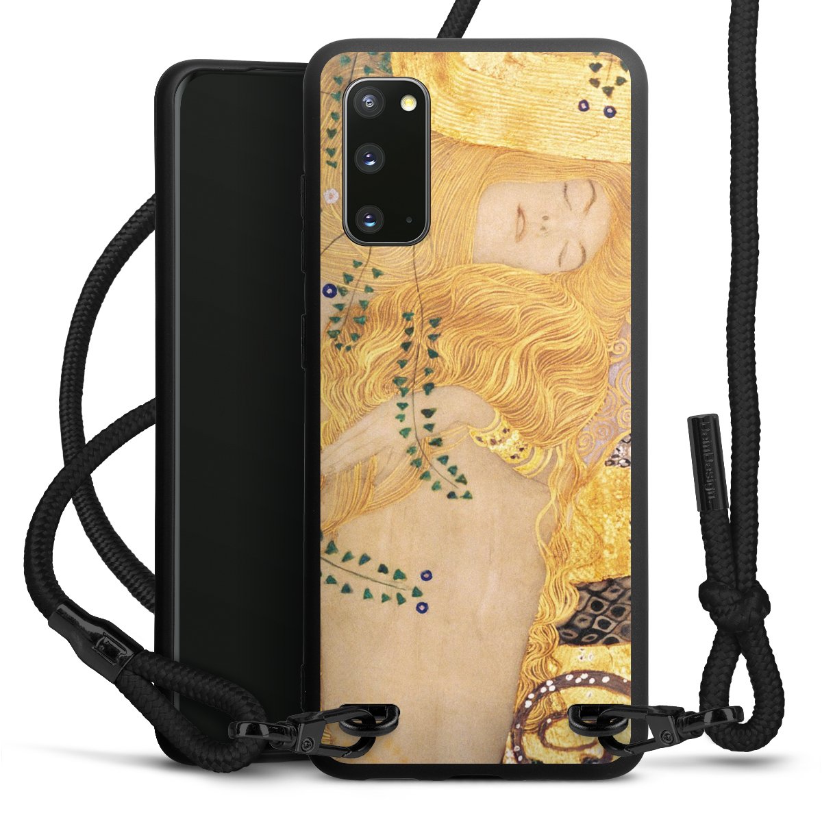 The matt black silicone case is made of flexible TPU (thermoplastic polyurethane) and offers robust protection. The durable, unbreakable material makes the cover flexible and dimensionally stable at the same time. The matte surface makes your design stand out more and is less susceptible to fingerprints and dirt. The stylish trend accessory fits comfortably in the hand and is perfectly complemented by the fabric (polyester) mobile phone strap. The braided fabric strap is approx. 1.70 metres long with a diameter of approx. 0.5 cm. Due to the special knotting technique, the length of the strap can be adjusted by simply pulling it, so that you can adapt it individually to your wishes. The practical case to wear around your neck is available with the fabric strap in black. As a little icing on the cake, we have provided the strap with a chic metal fastener in matt black. The strap is securely fastened to the case with loops made of high-quality genuine leather and press studs. The ends of the fabric strap are covered with metallic end caps and thus protected from fraying.
