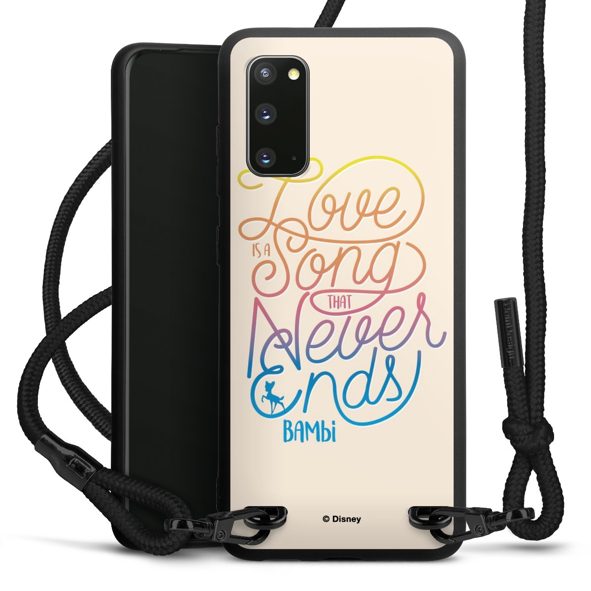 The matt black silicone case is made of flexible TPU (thermoplastic polyurethane) and offers robust protection. The durable, unbreakable material makes the cover flexible and dimensionally stable at the same time. The matte surface makes your design stand out more and is less susceptible to fingerprints and dirt. The stylish trend accessory fits comfortably in the hand and is perfectly complemented by the fabric (polyester) mobile phone strap. The braided fabric strap is approx. 1.70 metres long with a diameter of approx. 0.5 cm. Due to the special knotting technique, the length of the strap can be adjusted by simply pulling it, so that you can adapt it individually to your wishes. The practical case to wear around your neck is available with the fabric strap in black. As a little icing on the cake, we have provided the strap with a chic metal fastener in matt black. The strap is securely fastened to the case with loops made of high-quality genuine leather and press studs. The ends of the fabric strap are covered with metallic end caps and thus protected from fraying.