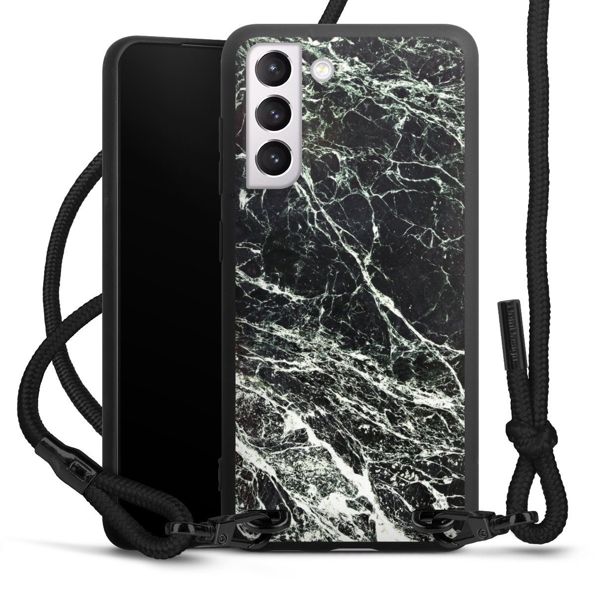 The matt black silicone case is made of flexible TPU (thermoplastic polyurethane) and offers robust protection. The durable, unbreakable material makes the cover flexible and dimensionally stable at the same time. The matte surface makes your design stand out more and is less susceptible to fingerprints and dirt. The stylish trend accessory fits comfortably in the hand and is perfectly complemented by the fabric (polyester) mobile phone strap. The braided fabric strap is approx. 1.70 metres long with a diameter of approx. 0.5 cm. Due to the special knotting technique, the length of the strap can be adjusted by simply pulling it, so that you can adapt it individually to your wishes. The practical case to wear around your neck is available with the fabric strap in black. As a little icing on the cake, we have provided the strap with a chic metal fastener in matt black. The strap is securely fastened to the case with loops made of high-quality genuine leather and press studs. The ends of the fabric strap are covered with metallic end caps and thus protected from fraying.
