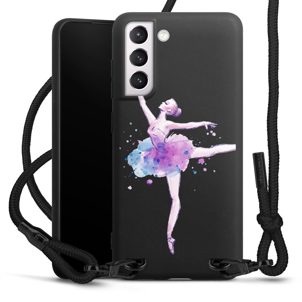 The matt black silicone case is made of flexible TPU (thermoplastic polyurethane) and offers robust protection. The durable, unbreakable material makes the cover flexible and dimensionally stable at the same time. The matte surface makes your design stand out more and is less susceptible to fingerprints and dirt. The stylish trend accessory fits comfortably in the hand and is perfectly complemented by the fabric (polyester) mobile phone strap. The braided fabric strap is approx. 1.70 metres long with a diameter of approx. 0.5 cm. Due to the special knotting technique, the length of the strap can be adjusted by simply pulling it, so that you can adapt it individually to your wishes. The practical case to wear around your neck is available with the fabric strap in black. As a little icing on the cake, we have provided the strap with a chic metal fastener in matt black. The strap is securely fastened to the case with loops made of high-quality genuine leather and press studs. The ends of the fabric strap are covered with metallic end caps and thus protected from fraying.