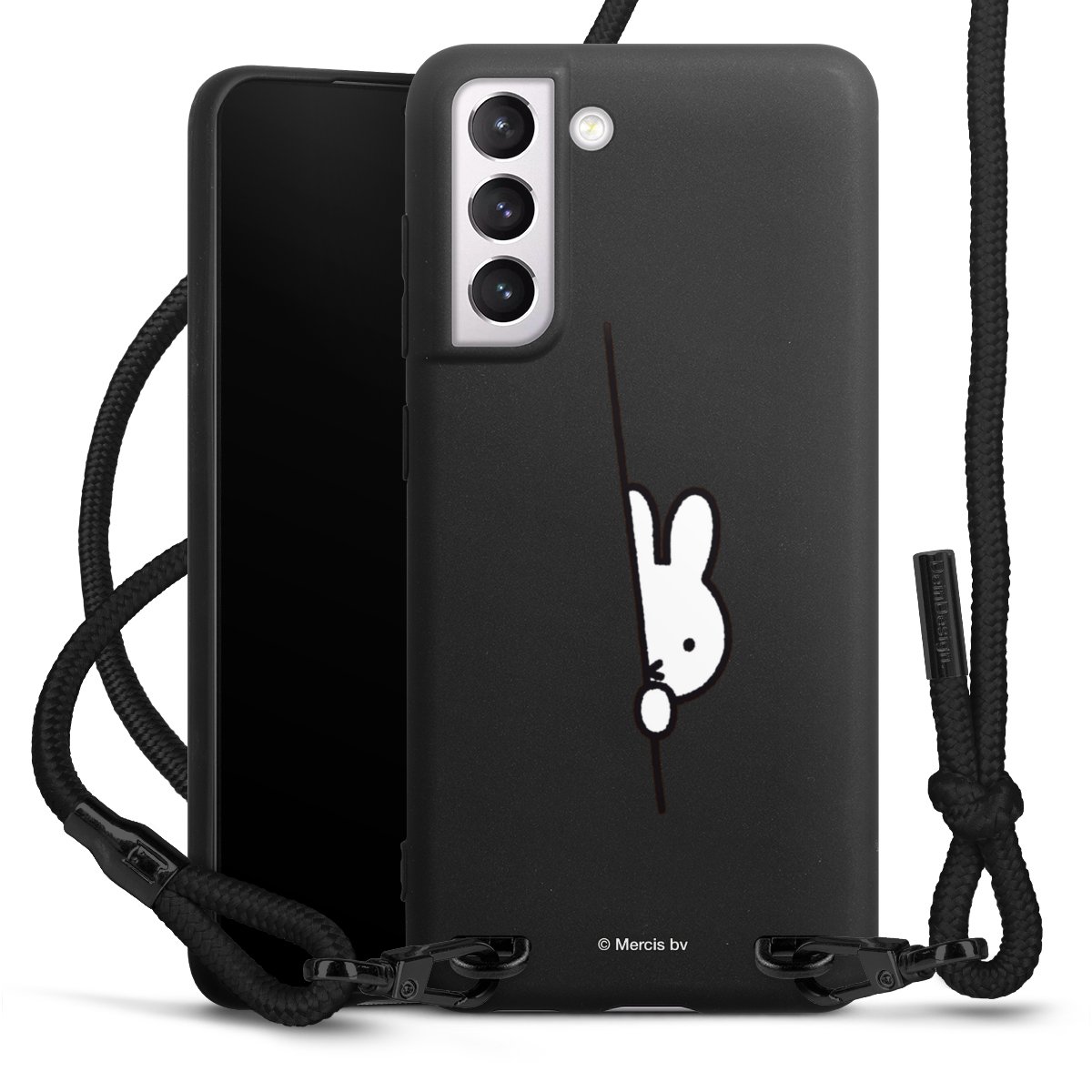 The matt black silicone case is made of flexible TPU (thermoplastic polyurethane) and offers robust protection. The durable, unbreakable material makes the cover flexible and dimensionally stable at the same time. The matte surface makes your design stand out more and is less susceptible to fingerprints and dirt. The stylish trend accessory fits comfortably in the hand and is perfectly complemented by the fabric (polyester) mobile phone strap. The braided fabric strap is approx. 1.70 metres long with a diameter of approx. 0.5 cm. Due to the special knotting technique, the length of the strap can be adjusted by simply pulling it, so that you can adapt it individually to your wishes. The practical case to wear around your neck is available with the fabric strap in black. As a little icing on the cake, we have provided the strap with a chic metal fastener in matt black. The strap is securely fastened to the case with loops made of high-quality genuine leather and press studs. The ends of the fabric strap are covered with metallic end caps and thus protected from fraying.