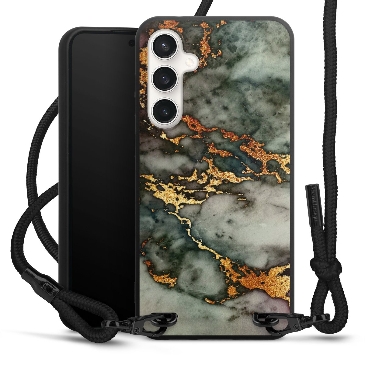 The matt black silicone case is made of flexible TPU (thermoplastic polyurethane) and offers robust protection. The durable, unbreakable material makes the cover flexible and dimensionally stable at the same time. The matte surface makes your design stand out more and is less susceptible to fingerprints and dirt. The stylish trend accessory fits comfortably in the hand and is perfectly complemented by the fabric (polyester) mobile phone strap. The braided fabric strap is approx. 1.70 metres long with a diameter of approx. 0.5 cm. Due to the special knotting technique, the length of the strap can be adjusted by simply pulling it, so that you can adapt it individually to your wishes. The practical case to wear around your neck is available with the fabric strap in black. As a little icing on the cake, we have provided the strap with a chic metal fastener in matt black. The strap is securely fastened to the case with loops made of high-quality genuine leather and press studs. The ends of the fabric strap are covered with metallic end caps and thus protected from fraying.