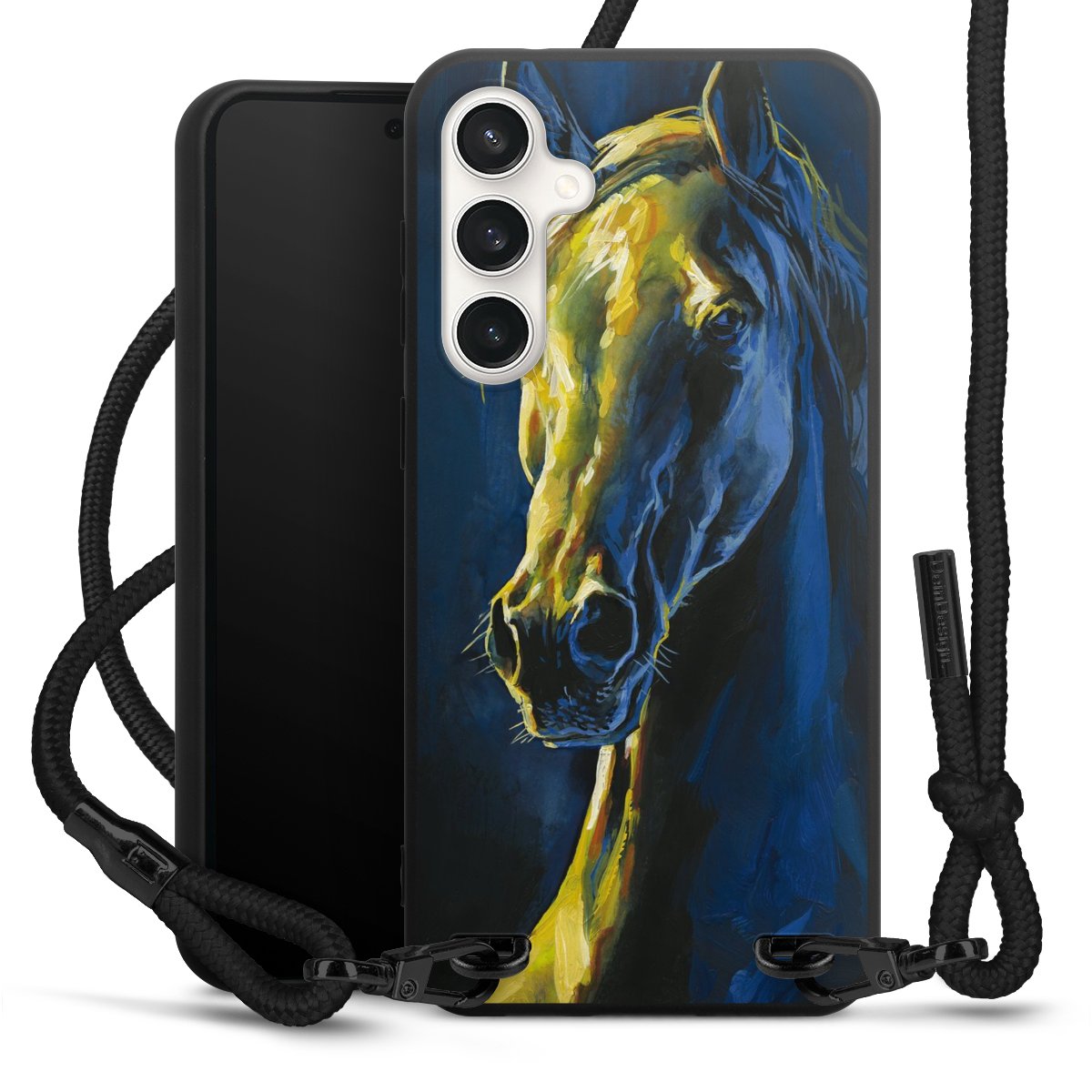 The matt black silicone case is made of flexible TPU (thermoplastic polyurethane) and offers robust protection. The durable, unbreakable material makes the cover flexible and dimensionally stable at the same time. The matte surface makes your design stand out more and is less susceptible to fingerprints and dirt. The stylish trend accessory fits comfortably in the hand and is perfectly complemented by the fabric (polyester) mobile phone strap. The braided fabric strap is approx. 1.70 metres long with a diameter of approx. 0.5 cm. Due to the special knotting technique, the length of the strap can be adjusted by simply pulling it, so that you can adapt it individually to your wishes. The practical case to wear around your neck is available with the fabric strap in black. As a little icing on the cake, we have provided the strap with a chic metal fastener in matt black. The strap is securely fastened to the case with loops made of high-quality genuine leather and press studs. The ends of the fabric strap are covered with metallic end caps and thus protected from fraying.