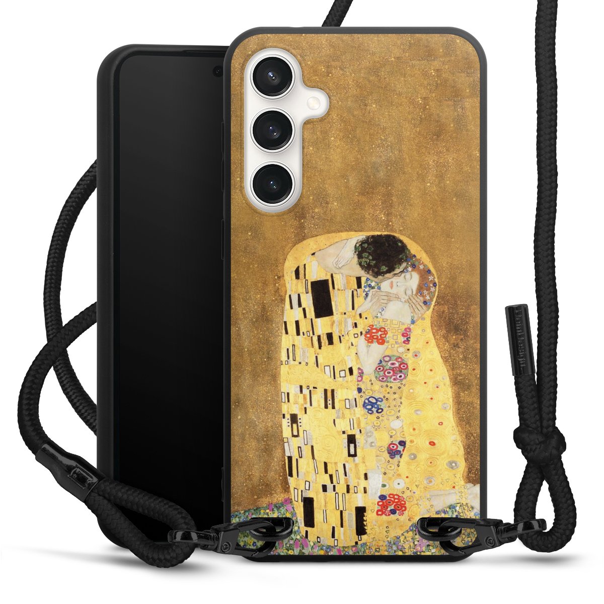 The matt black silicone case is made of flexible TPU (thermoplastic polyurethane) and offers robust protection. The durable, unbreakable material makes the cover flexible and dimensionally stable at the same time. The matte surface makes your design stand out more and is less susceptible to fingerprints and dirt. The stylish trend accessory fits comfortably in the hand and is perfectly complemented by the fabric (polyester) mobile phone strap. The braided fabric strap is approx. 1.70 metres long with a diameter of approx. 0.5 cm. Due to the special knotting technique, the length of the strap can be adjusted by simply pulling it, so that you can adapt it individually to your wishes. The practical case to wear around your neck is available with the fabric strap in black. As a little icing on the cake, we have provided the strap with a chic metal fastener in matt black. The strap is securely fastened to the case with loops made of high-quality genuine leather and press studs. The ends of the fabric strap are covered with metallic end caps and thus protected from fraying.
