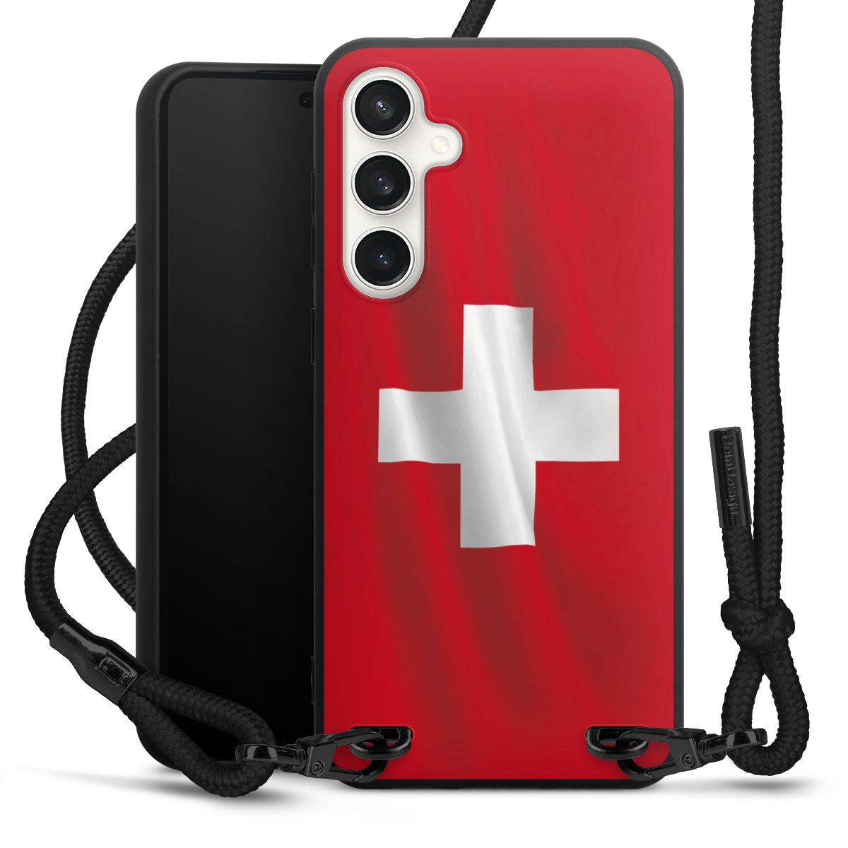 The matt black silicone case is made of flexible TPU (thermoplastic polyurethane) and offers robust protection. The durable, unbreakable material makes the cover flexible and dimensionally stable at the same time. The matte surface makes your design stand out more and is less susceptible to fingerprints and dirt. The stylish trend accessory fits comfortably in the hand and is perfectly complemented by the fabric (polyester) mobile phone strap. The braided fabric strap is approx. 1.70 metres long with a diameter of approx. 0.5 cm. Due to the special knotting technique, the length of the strap can be adjusted by simply pulling it, so that you can adapt it individually to your wishes. The practical case to wear around your neck is available with the fabric strap in black. As a little icing on the cake, we have provided the strap with a chic metal fastener in matt black. The strap is securely fastened to the case with loops made of high-quality genuine leather and press studs. The ends of the fabric strap are covered with metallic end caps and thus protected from fraying.