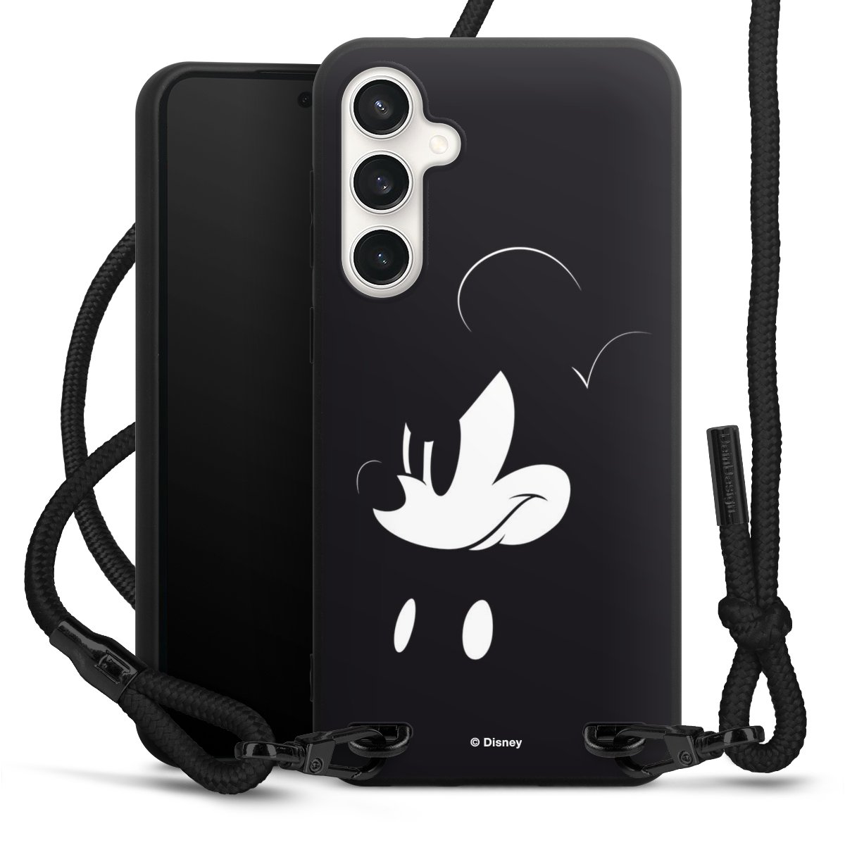 The matt black silicone case is made of flexible TPU (thermoplastic polyurethane) and offers robust protection. The durable, unbreakable material makes the cover flexible and dimensionally stable at the same time. The matte surface makes your design stand out more and is less susceptible to fingerprints and dirt. The stylish trend accessory fits comfortably in the hand and is perfectly complemented by the fabric (polyester) mobile phone strap. The braided fabric strap is approx. 1.70 metres long with a diameter of approx. 0.5 cm. Due to the special knotting technique, the length of the strap can be adjusted by simply pulling it, so that you can adapt it individually to your wishes. The practical case to wear around your neck is available with the fabric strap in black. As a little icing on the cake, we have provided the strap with a chic metal fastener in matt black. The strap is securely fastened to the case with loops made of high-quality genuine leather and press studs. The ends of the fabric strap are covered with metallic end caps and thus protected from fraying.
