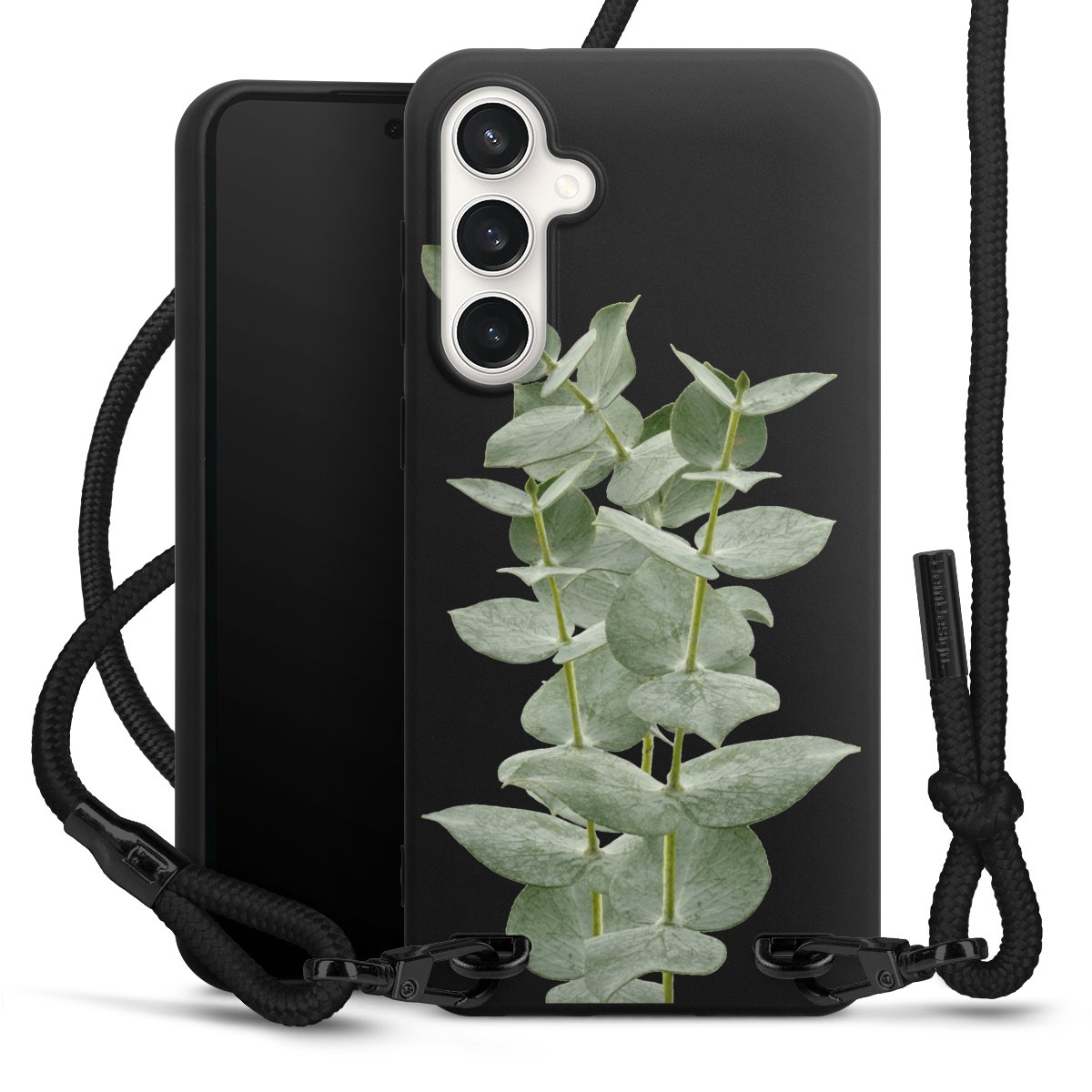 The matt black silicone case is made of flexible TPU (thermoplastic polyurethane) and offers robust protection. The durable, unbreakable material makes the cover flexible and dimensionally stable at the same time. The matte surface makes your design stand out more and is less susceptible to fingerprints and dirt. The stylish trend accessory fits comfortably in the hand and is perfectly complemented by the fabric (polyester) mobile phone strap. The braided fabric strap is approx. 1.70 metres long with a diameter of approx. 0.5 cm. Due to the special knotting technique, the length of the strap can be adjusted by simply pulling it, so that you can adapt it individually to your wishes. The practical case to wear around your neck is available with the fabric strap in black. As a little icing on the cake, we have provided the strap with a chic metal fastener in matt black. The strap is securely fastened to the case with loops made of high-quality genuine leather and press studs. The ends of the fabric strap are covered with metallic end caps and thus protected from fraying.