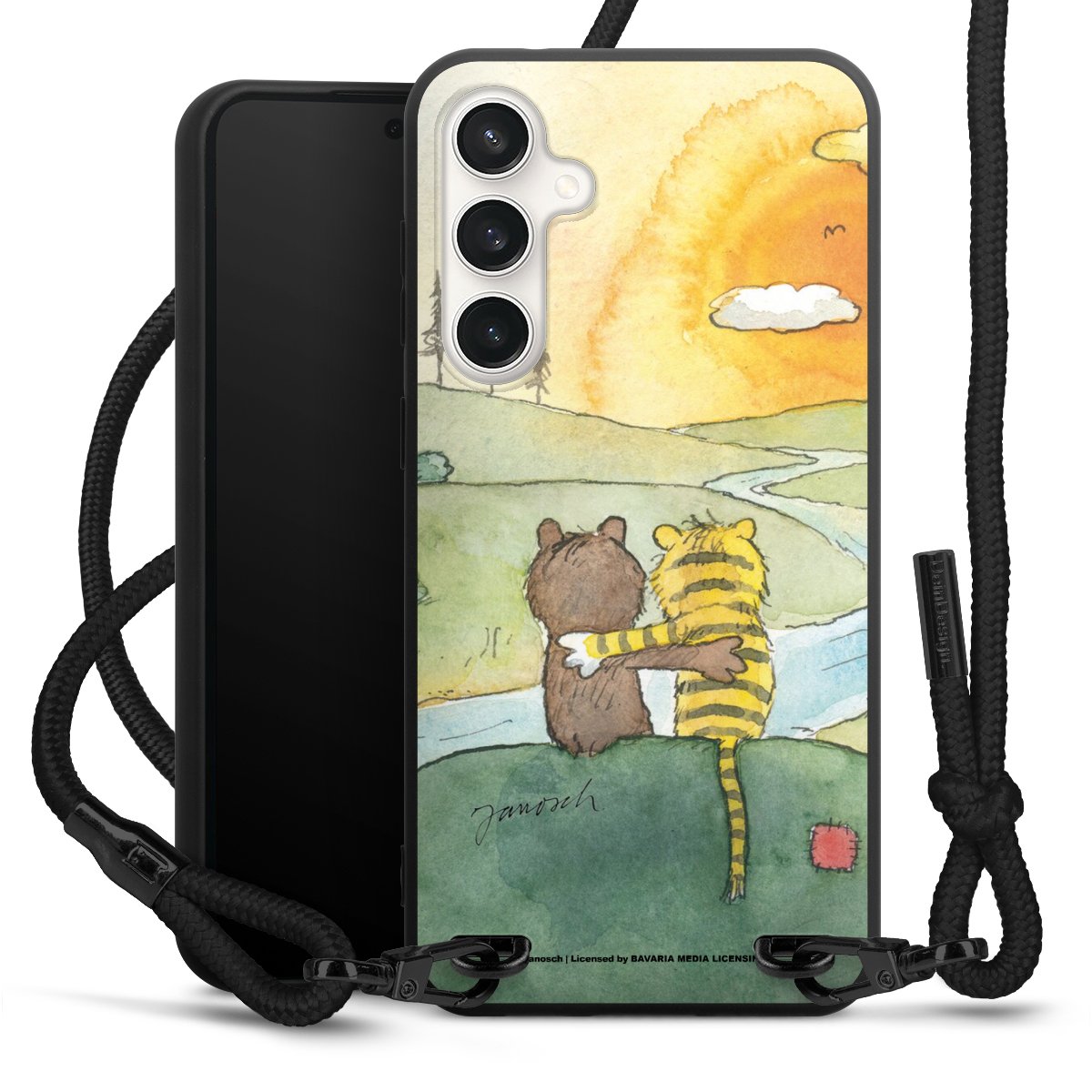 The matt black silicone case is made of flexible TPU (thermoplastic polyurethane) and offers robust protection. The durable, unbreakable material makes the cover flexible and dimensionally stable at the same time. The matte surface makes your design stand out more and is less susceptible to fingerprints and dirt. The stylish trend accessory fits comfortably in the hand and is perfectly complemented by the fabric (polyester) mobile phone strap. The braided fabric strap is approx. 1.70 metres long with a diameter of approx. 0.5 cm. Due to the special knotting technique, the length of the strap can be adjusted by simply pulling it, so that you can adapt it individually to your wishes. The practical case to wear around your neck is available with the fabric strap in black. As a little icing on the cake, we have provided the strap with a chic metal fastener in matt black. The strap is securely fastened to the case with loops made of high-quality genuine leather and press studs. The ends of the fabric strap are covered with metallic end caps and thus protected from fraying.