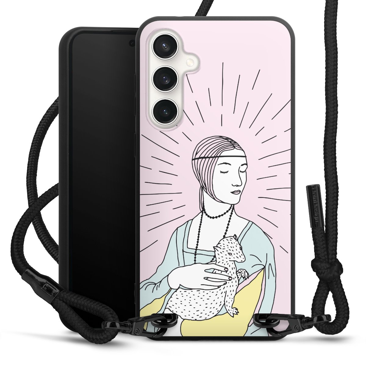 The matt black silicone case is made of flexible TPU (thermoplastic polyurethane) and offers robust protection. The durable, unbreakable material makes the cover flexible and dimensionally stable at the same time. The matte surface makes your design stand out more and is less susceptible to fingerprints and dirt. The stylish trend accessory fits comfortably in the hand and is perfectly complemented by the fabric (polyester) mobile phone strap. The braided fabric strap is approx. 1.70 metres long with a diameter of approx. 0.5 cm. Due to the special knotting technique, the length of the strap can be adjusted by simply pulling it, so that you can adapt it individually to your wishes. The practical case to wear around your neck is available with the fabric strap in black. As a little icing on the cake, we have provided the strap with a chic metal fastener in matt black. The strap is securely fastened to the case with loops made of high-quality genuine leather and press studs. The ends of the fabric strap are covered with metallic end caps and thus protected from fraying.